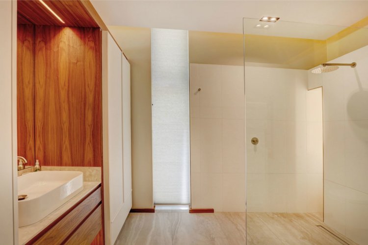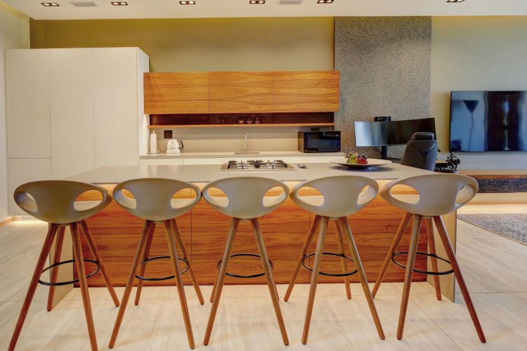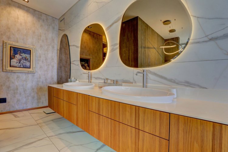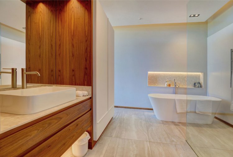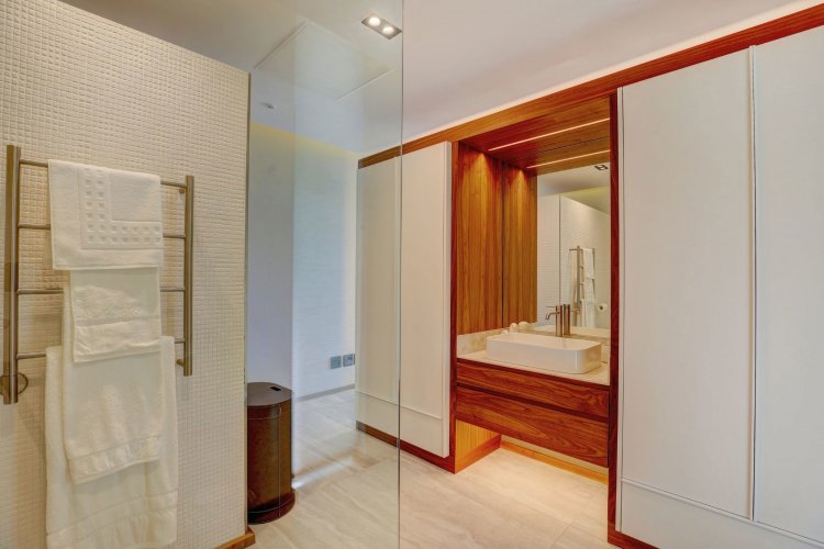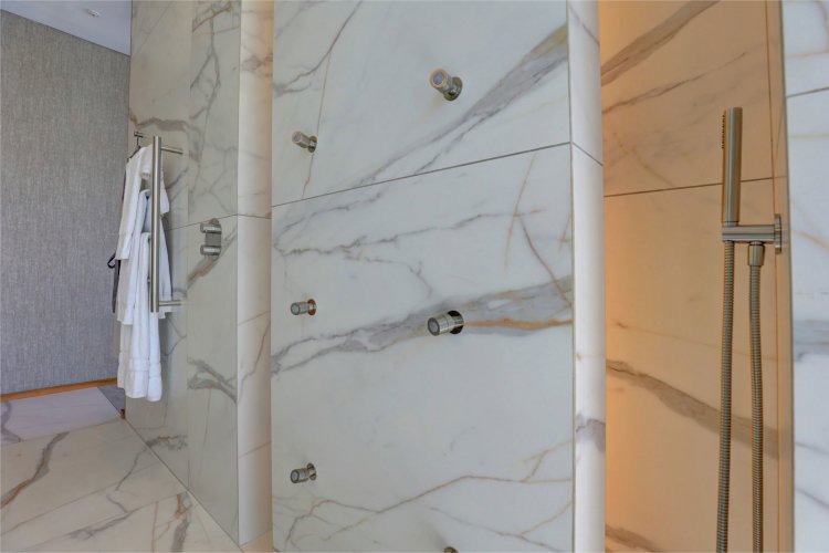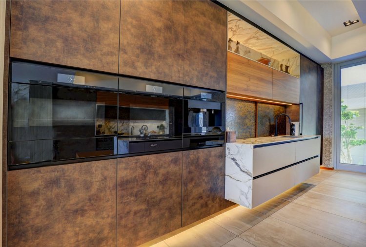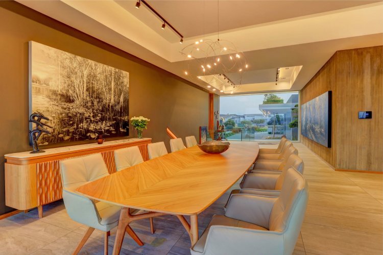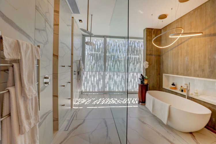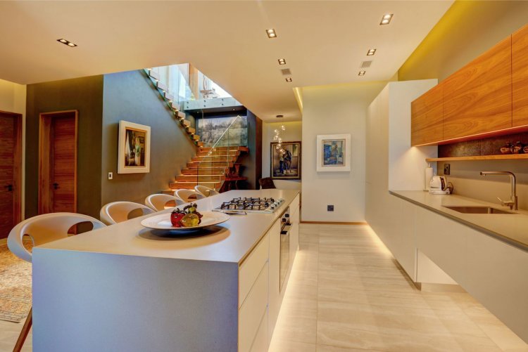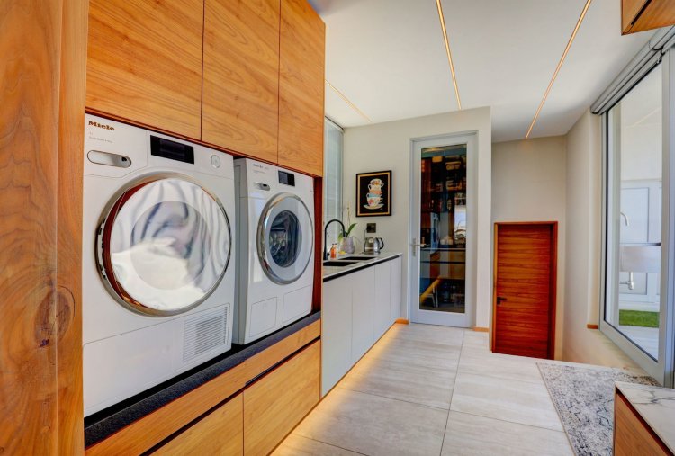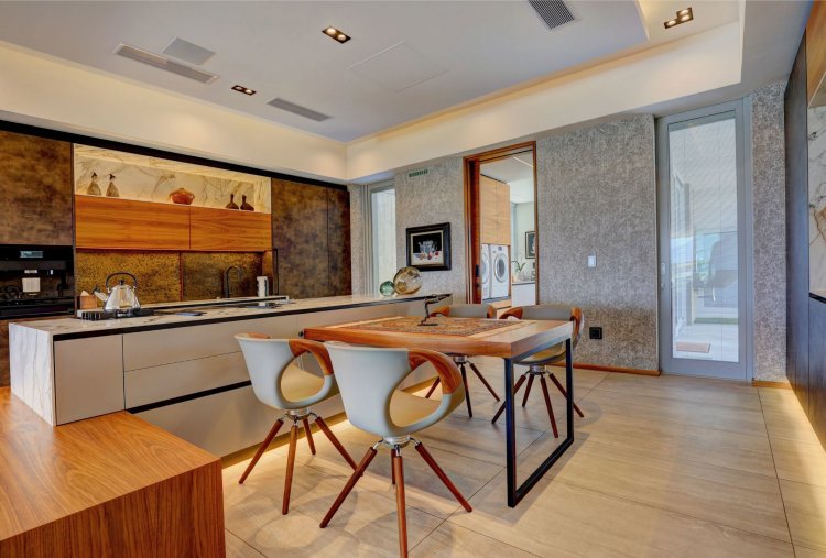 Double glazed glass throughout, with selected panels featuring integrated remote controlled blinds, enhances comfort and efficiency. The gourmet kitchen—designed in collaboration with De Steyl—features custom cabinetry, imported Miele appliances, a teppanyaki grill, glass gas hob, built in fridge/freezers, concealed brass fronted storage, a dedicated wine cupboard and three ovens including a steam oven. A built in cappuccino machine and additional hidden luxuries elevate the culinary experience.