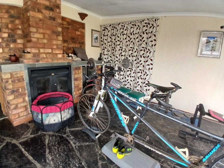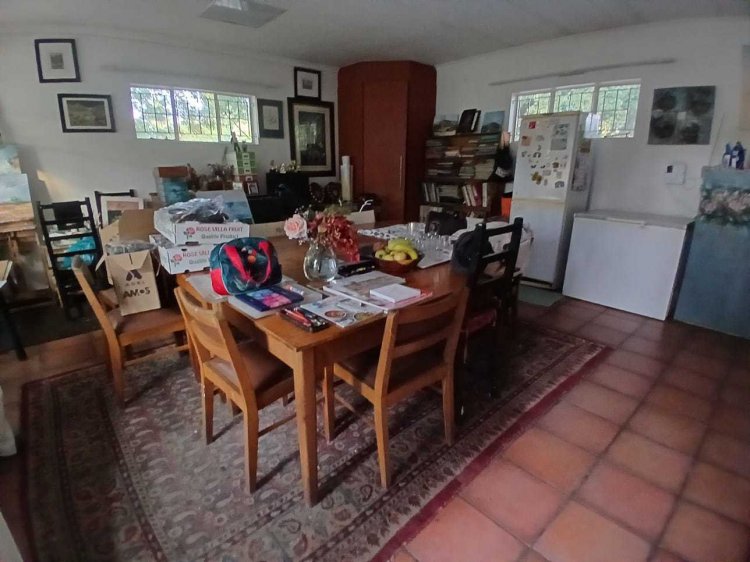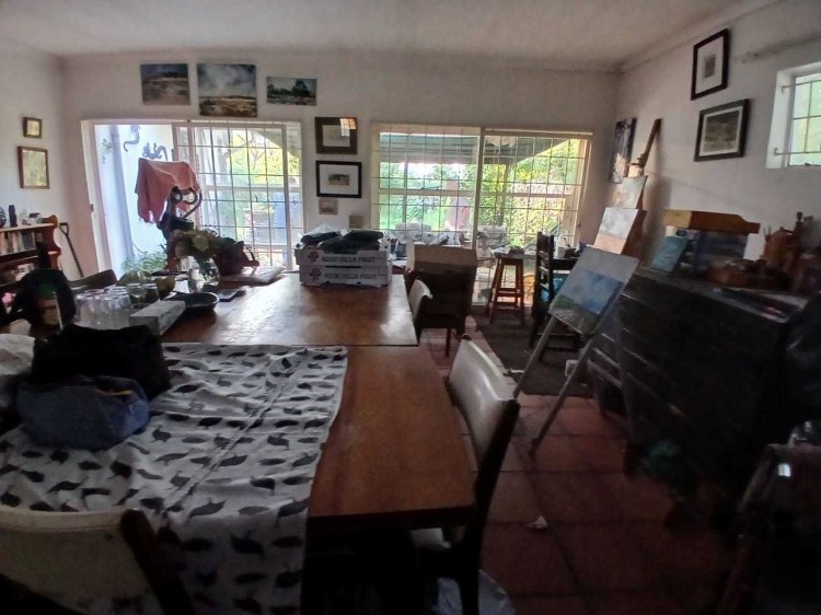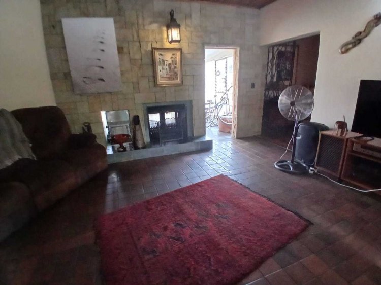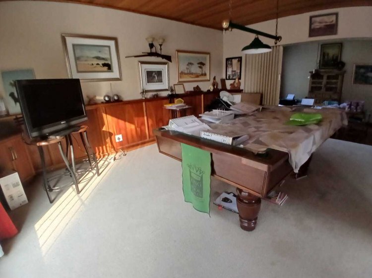 The main house has four entrances. Inside, you'll find a spacious kitchen with built-in units, double oven, guest stove, pantry, and a food server opening to the dining area. The open-plan dining and lounge lead to a TV room with a fireplace and a gym room.