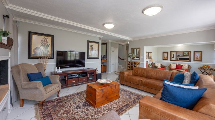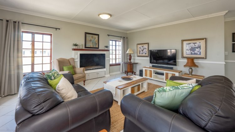 The ground level features spacious open-plan living and kitchen areas, complete with an indoor braai for year-round entertaining. A generous lounge with a large fireplace creates a warm and inviting atmosphere, while the impressive master suite includes a vast dressing room with ample cupboard space. This level also offers direct access to a double garage. A water filtration system, as well as a solar panel and inverter setup, are already in place to ensure energy efficiency and convenience.