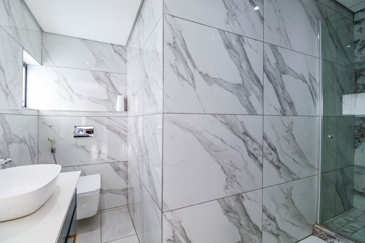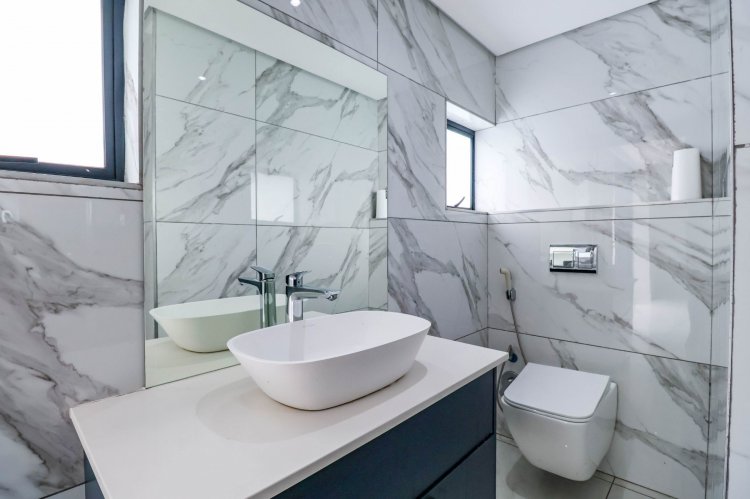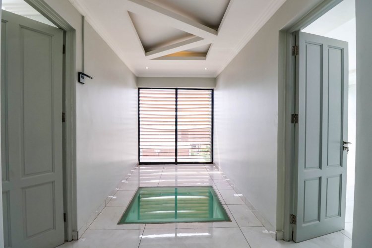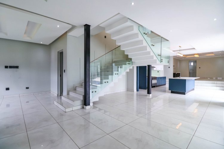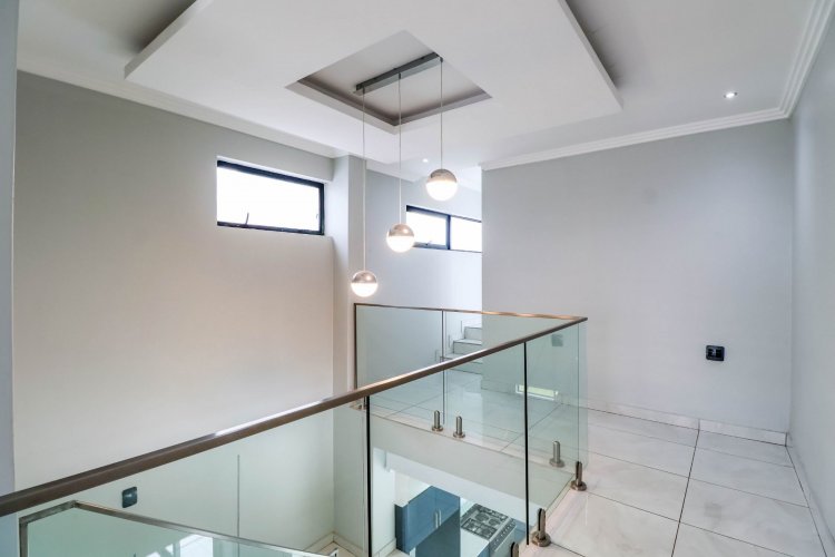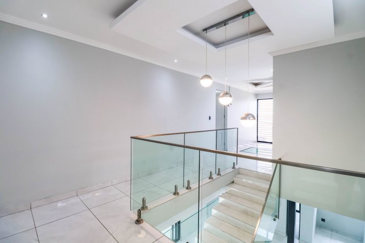 From the moment you enter, the dramatic double-volume entrance hall sets the tone, crowned by a striking glass floor feature from the second level — a bold architectural element that immediately distinguishes this home. The staircase is illuminated by automated LED lighting, creating an ambient, contemporary flow throughout the residence.