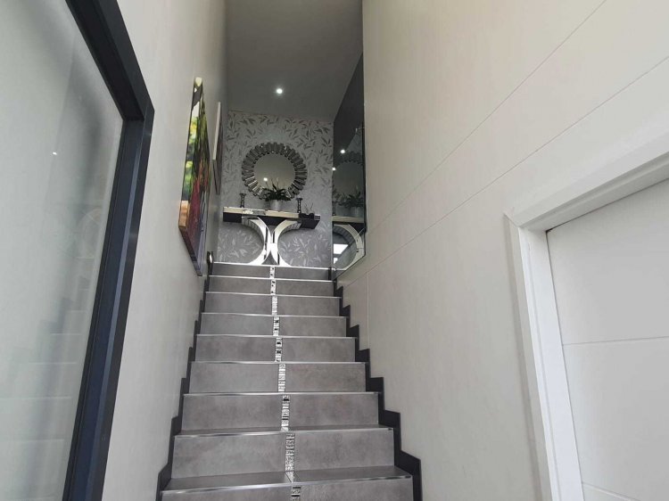 The property features a contemporary open-plan kitchen that flows seamlessly into the living area, where the lounge enjoys pleasant views, creating a light and inviting space. An enclosed private garden provides the perfect setting for outdoor relaxation or entertaining, while the double lock-up garage ensures secure and convenient parking.