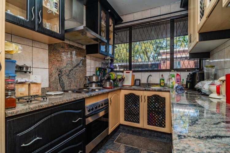 Downstairs features an open-plan dining area flowing into lounge plus extra TV lounge, which opens out onto a covered patio and neat garden, perfect for relaxing or entertaining. The kitchen is well-appointed with granite countertops, an under-counter oven, hob, and ample cupboard space.