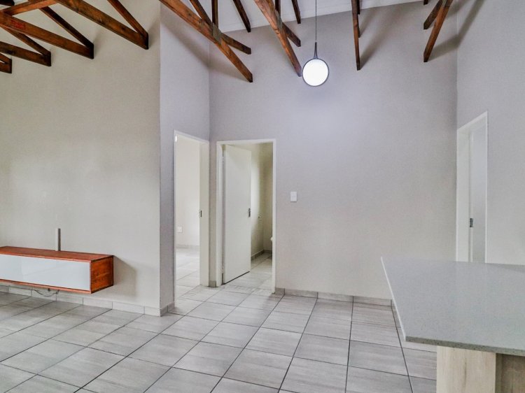 Offering 2 spacious bedrooms and 2 bathrooms (main en-suite), an open-plan living area, and a stylish modern kitchen with granite countertops. High-volume ceilings with exposed trusses and aluminium window frames add a clean, contemporary feel.