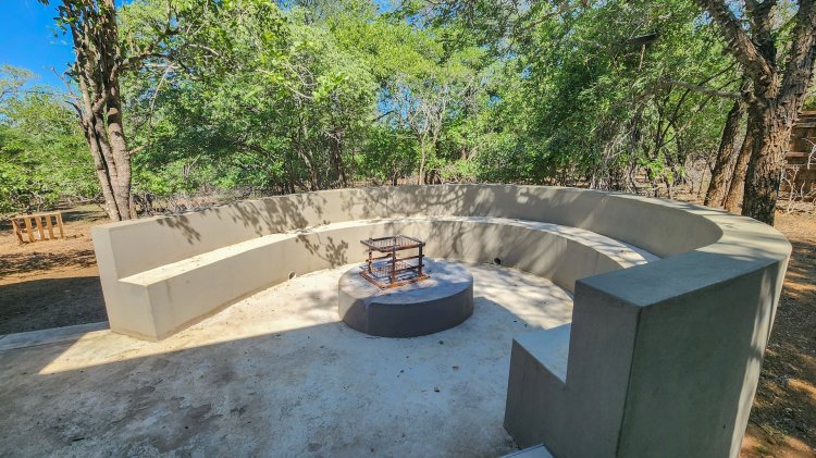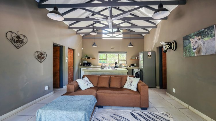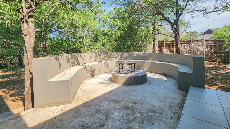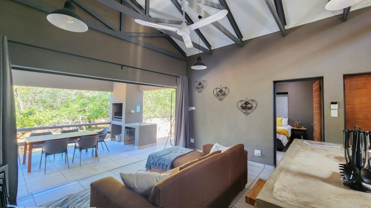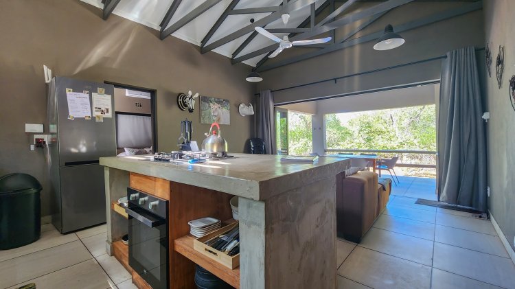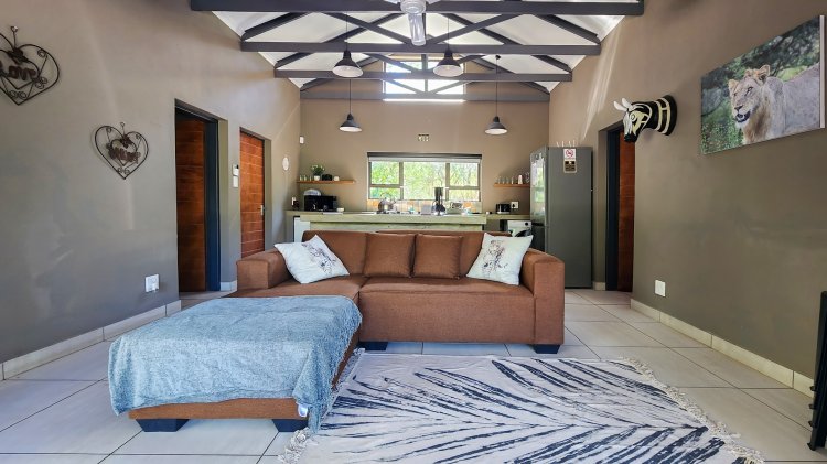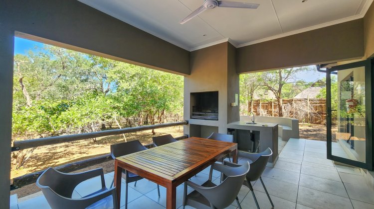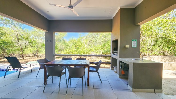 The open-plan living flows seamlessly onto a spacious stoep overlooking the beautiful Marloth Park nature, where wildlife often passes by. Outdoor living is a highlight, with a built-in braai, a convenient kitchen basin next to the braai, and a cozy boma—ideal for evenings around the fire.