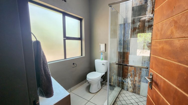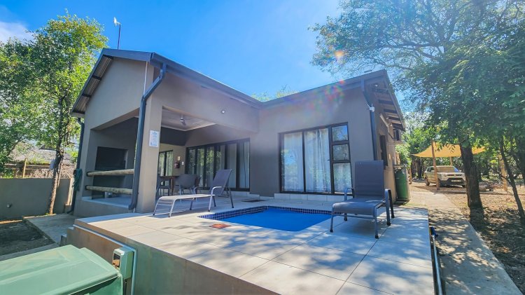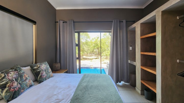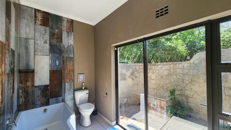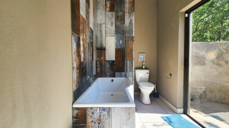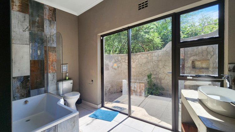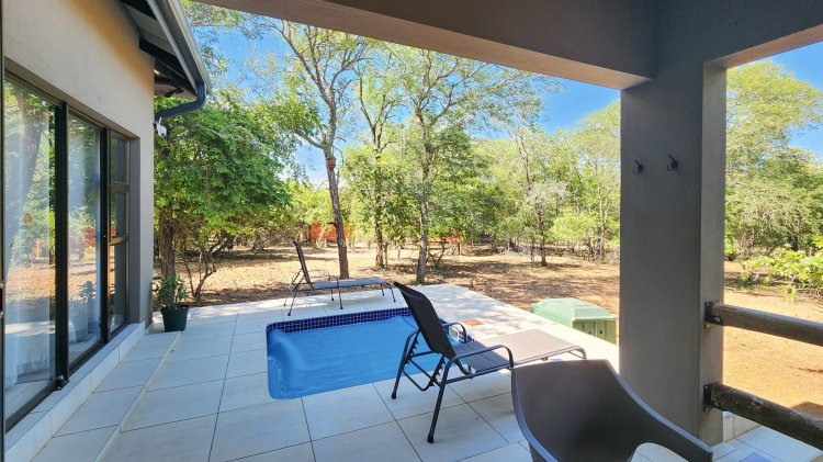 Cool off on warm Lowveld days in the sparkling splash pool, perfectly positioned for enjoying the natural surroundings. The main bedroom offers a touch of luxury with a bathtub and an outdoor shower, blending comfort with nature.