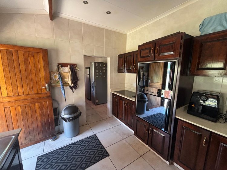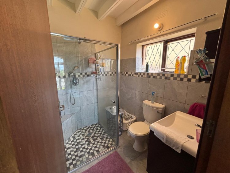 Main House – Upper Level • Welcoming entrance hall leading into an open-plan lounge with bar, flowing seamlessly through glass sliding doors. • Separate dining room with serving hatch from the kitchen – ideal for entertaining. • Well-appointed kitchen featuring ample cabinetry, double eye-level oven, hob, and a separate scullery and laundry area. • Two bedrooms, both enjoying distant sea views.