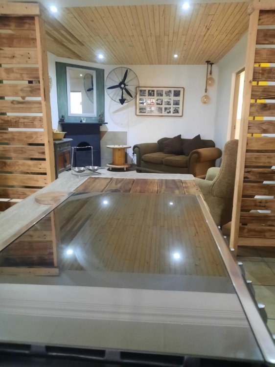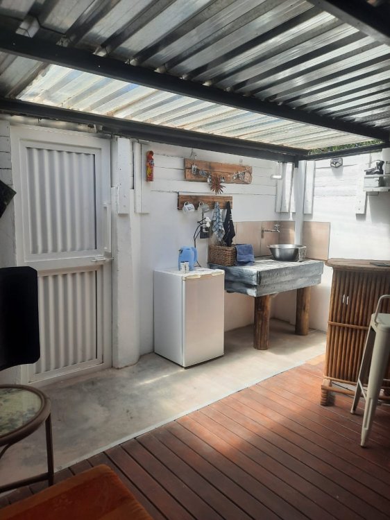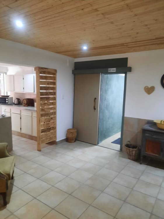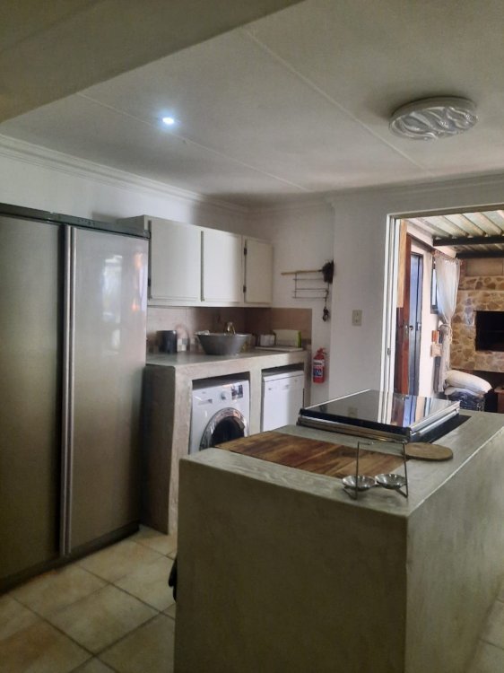 The second unit offers a more spacious layout and includes its own entrance. The kitchen is fitted with cupboards and a gas stove, flowing into a lounge area with a fireplace. An entertainment area with a built-in braai creates the perfect space for relaxing and hosting guests. Two smaller bedrooms and a bathroom with a shower complete this section, while a private courtyard adds to the outdoor living appeal.