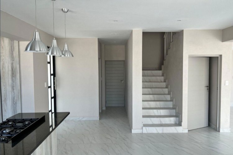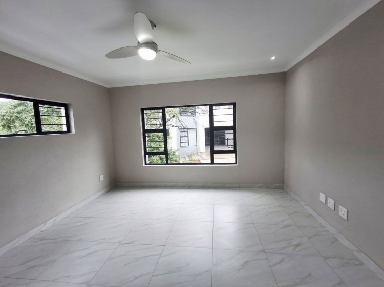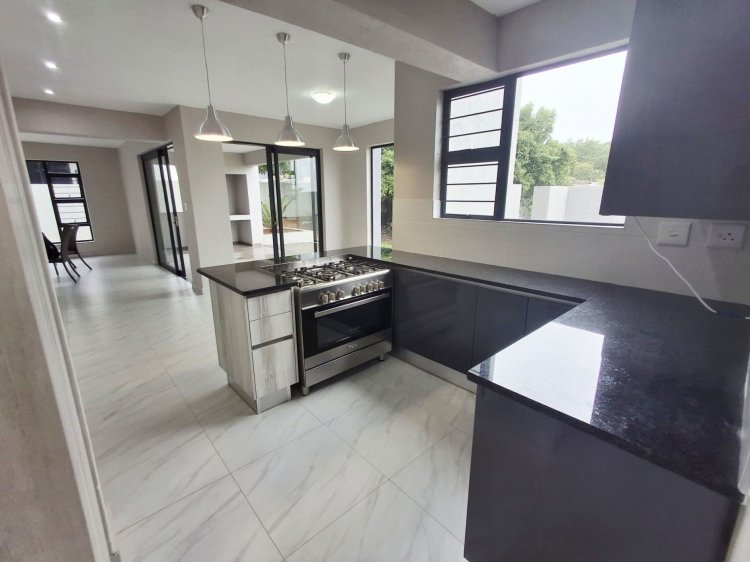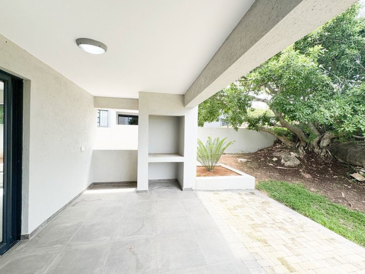 The home features three spacious bedrooms, all fitted with built-in cupboards and air-conditioning. The main bedroom includes a luxurious en-suite bathroom with both a bath and shower. The second bathroom offers a shower, and there is an additional guest toilet for convenience. A modern open-plan kitchen forms the heart of the home, complete with a gas stove and high-end finishes, flowing seamlessly into the lounge and dining area. Sliding doors open onto a private patio equipped with a built-in braai, creating the perfect space for entertaining.