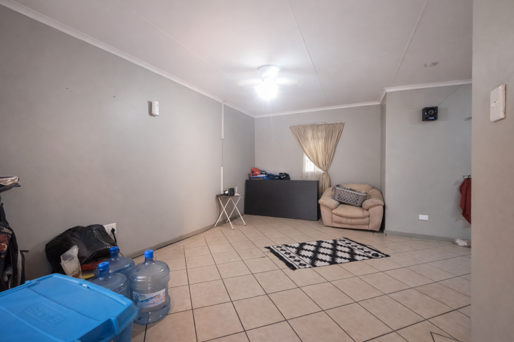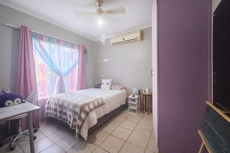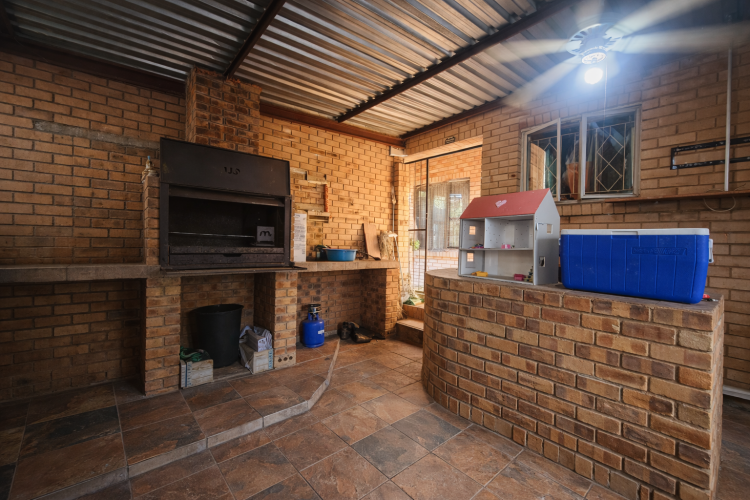 An enclosed lapa with a built-in bar and braai, ideally positioned close to the kitchen and opening onto a spacious lawn with a charming citrus tree. The backyard is private and practical, complete with a Wendy house for storage and a 2 500 L JoJo tank providing backup water.