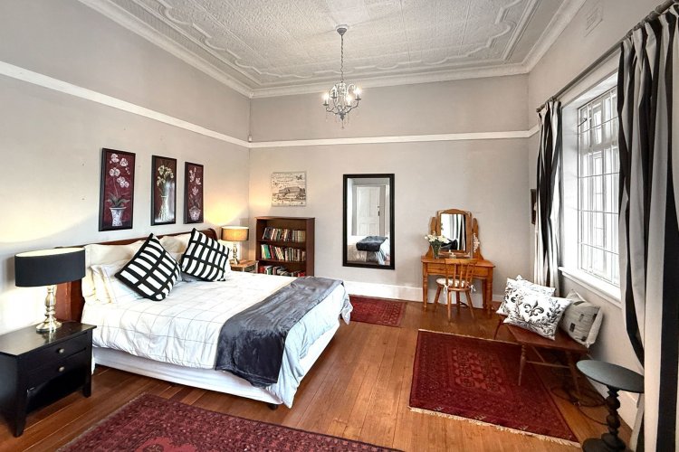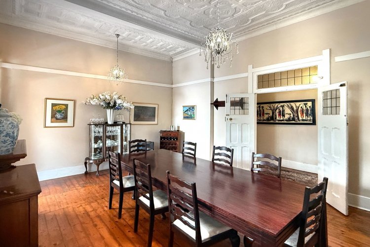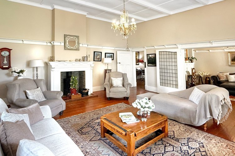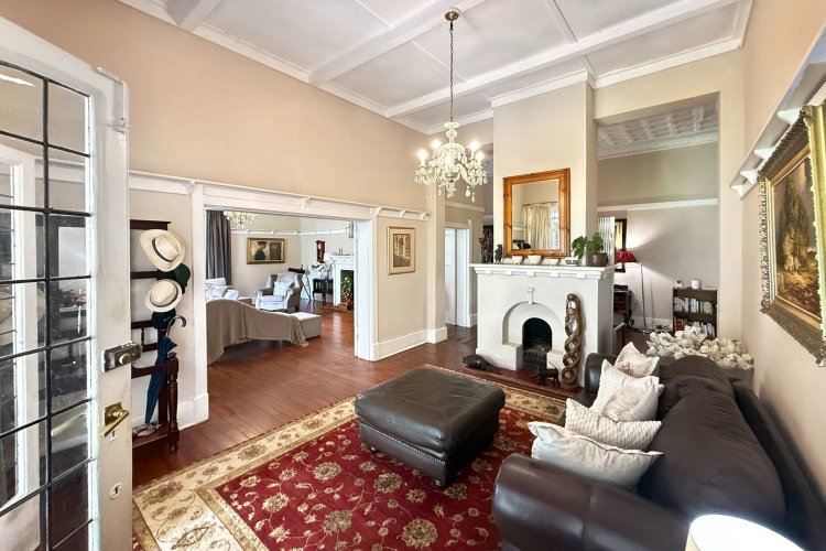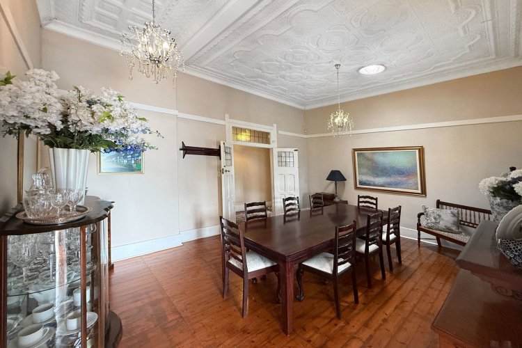 The front veranda welcomes you into a character-rich entrance hall highlighted by a stunning wood fireplace. Inside, you'll find exquisite, pressed ceilings and rich wooden floors that enhance the home's timeless appeal. The spacious lounge features a bay window and a cozy Morso fireplace, creating an inviting atmosphere. The dining room, adorned with a skylight, opens onto a second veranda, perfect for entertaining.