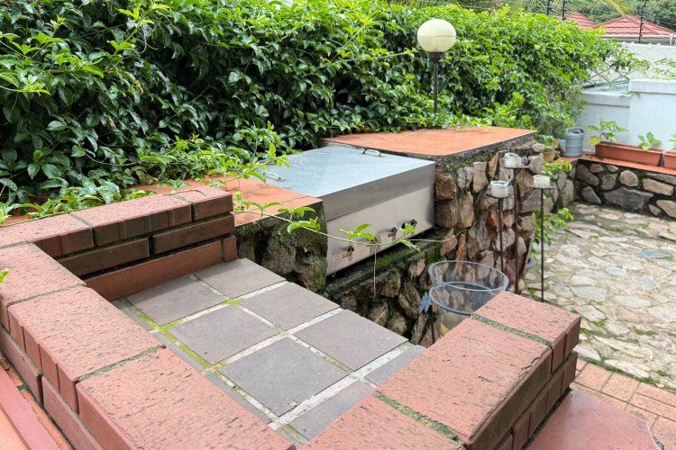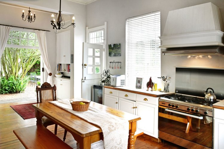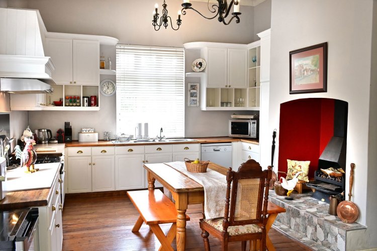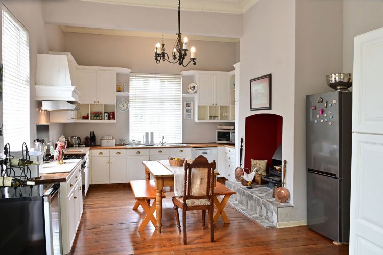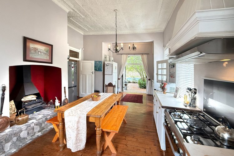 The entertainer's eat-in kitchen, equipped with a gas stove and oven, includes a cozy wood fireplace and conveniently opens to the pool and braai area, making indoor-outdoor living a breeze.