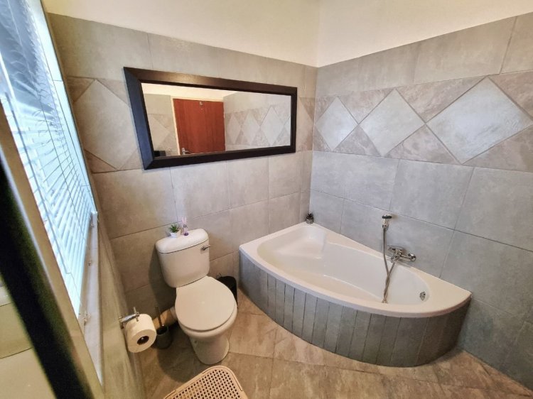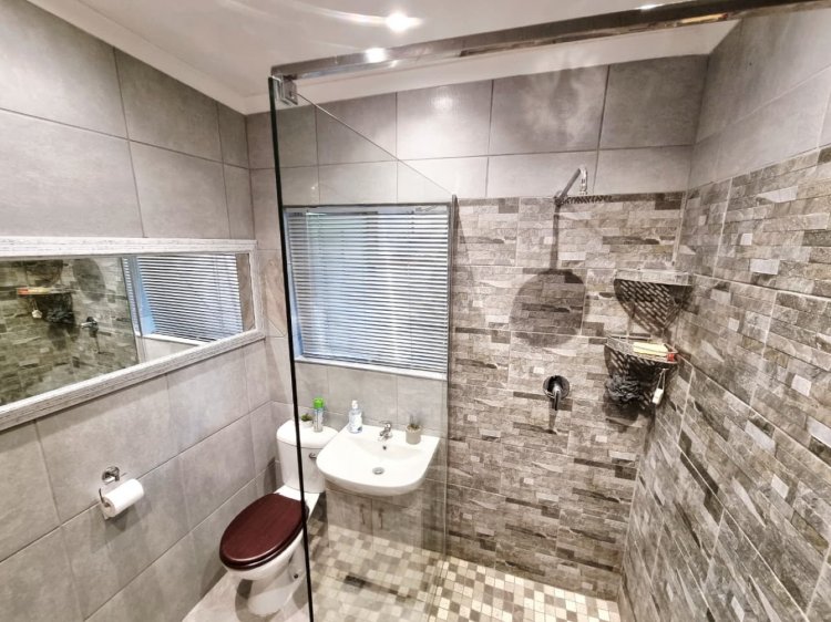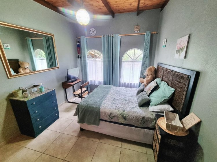The three generously sized bedrooms are positioned for comfort and privacy. The main bedroom features a newly renovated en-suite bathroom, while the remaining bedrooms share a second newly renovated bathroom, already upgraded with clean, modern finishes. Large arched windows throughout the home draw in natural light and showcase leafy garden views, reinforcing the calm Bushveld atmosphere.