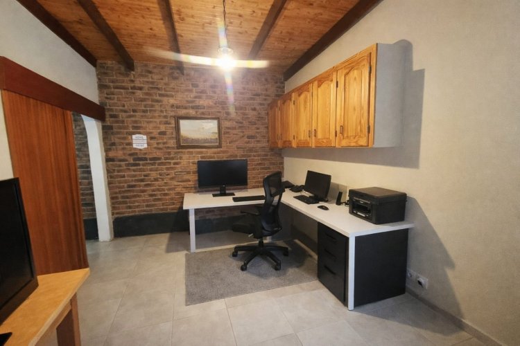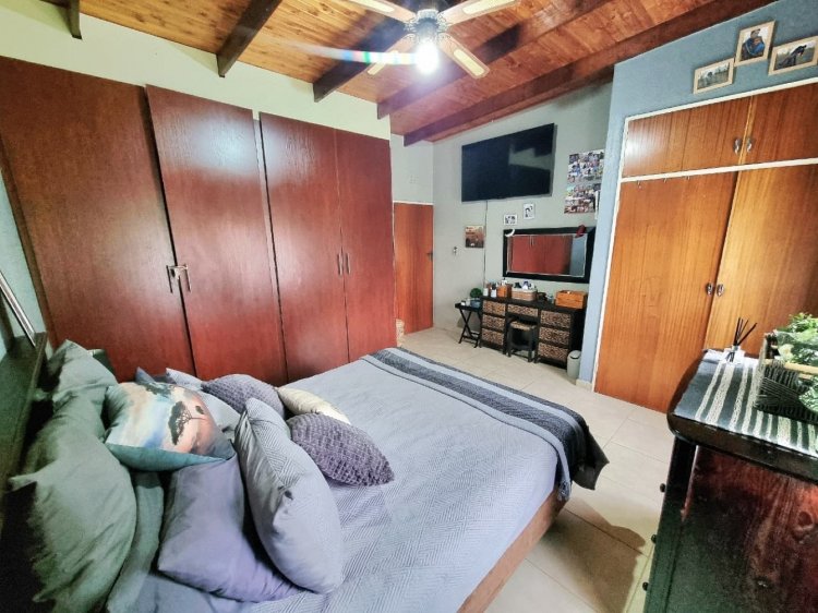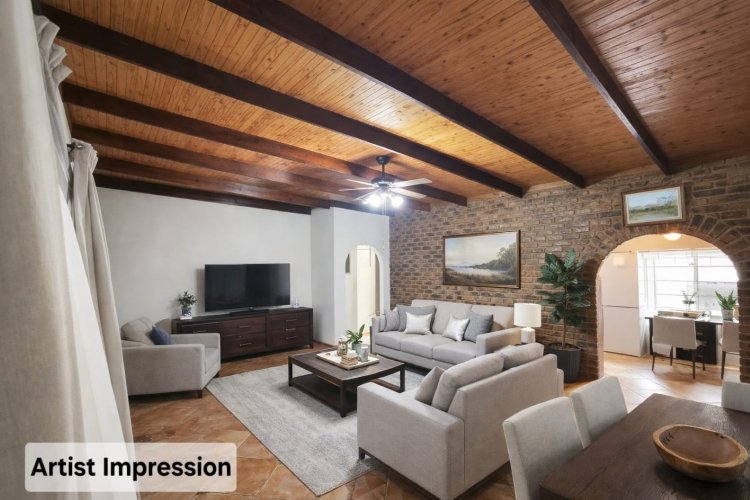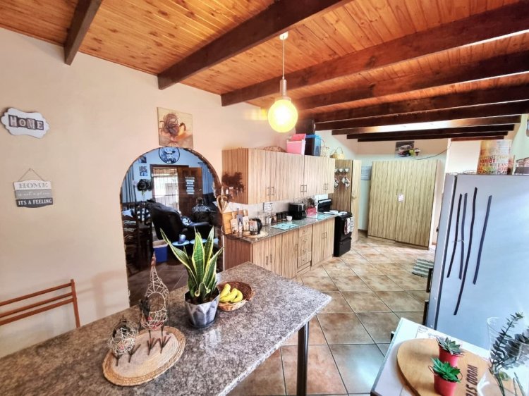 A welcoming front stoep with a built-in braai sets the scene for relaxed Bushveld living under mature trees. Inside, the air-conditioned open-plan living and dining area is warm and inviting, anchored by a rustic open-brick feature wall that gives the home personality and soul. The spacious kitchen and separate laundry offer a solid, functional base — perfect for those wanting to add their own stamp through a tasteful revamp.