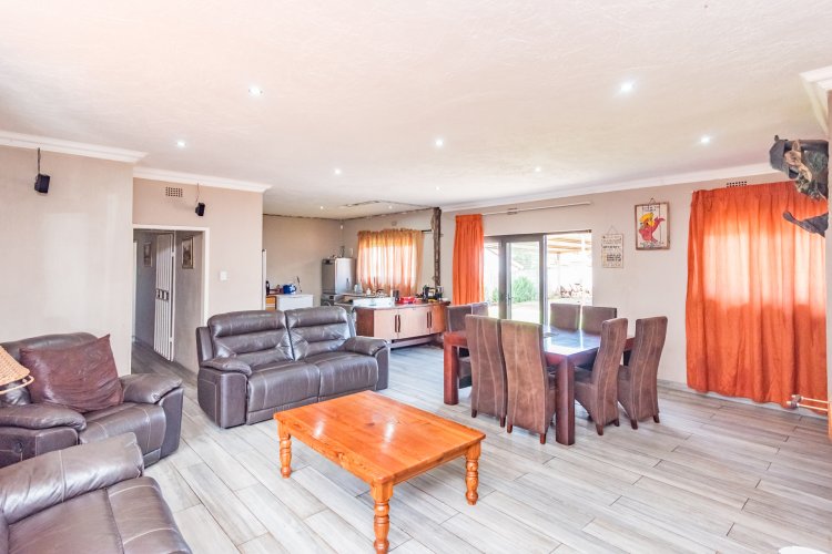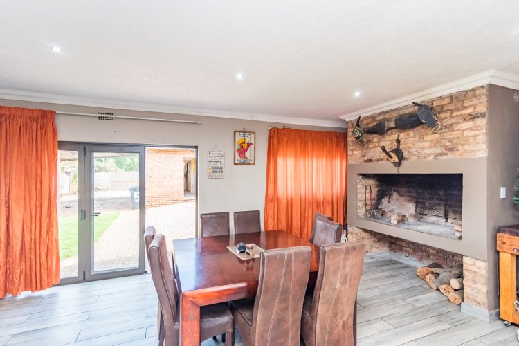 The heart of the home is the spacious, well-appointed kitchen, offering ample cupboard space and a gas stove—perfect for both everyday cooking and hosting guests. The kitchen flows effortlessly into the open-plan lounge, TV room, and dining area, creating a seamless living environment. A fireplace adds warmth and character to the space, enhancing the inviting atmosphere and making it ideal for relaxed family living and indoor entertaining.