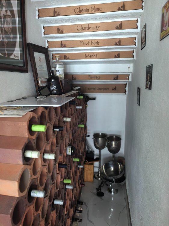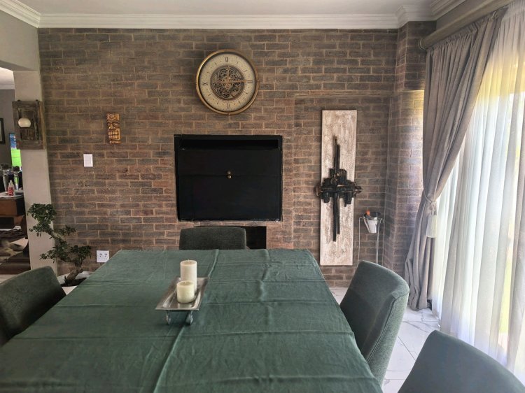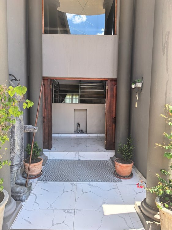 Key features, 3 bedrooms (main en-suite), 3.5 bathrooms, open plan lounge , dining room, wine cellar, built-in bar with marble top, gourmet kitchen (newly installed), formal lounge upstairs with fireplace, thatch outside with pizza oven and power points, swimming pool with solar panels, solar panels with inverter, stainless steel balustrading and outside toilet.