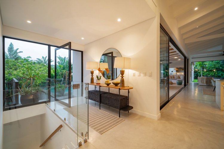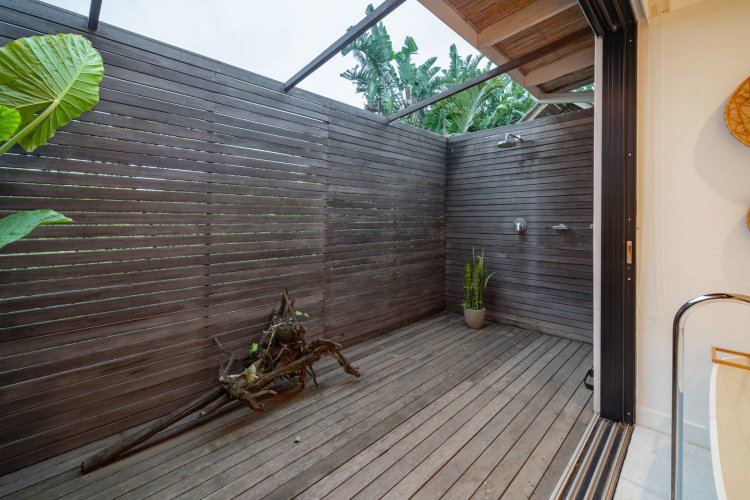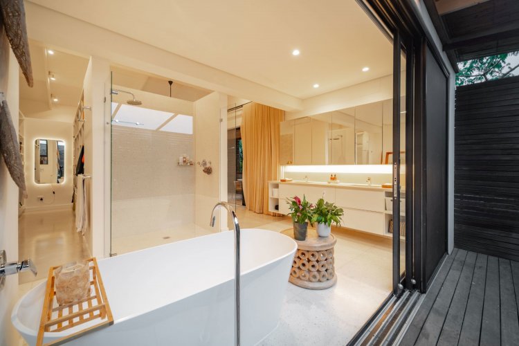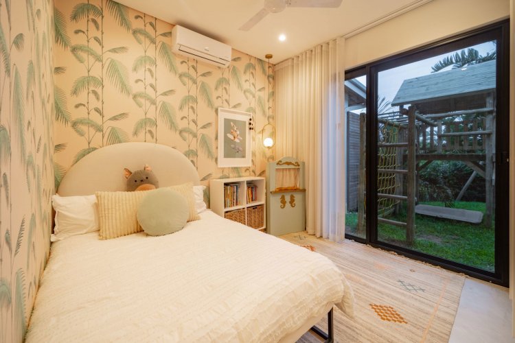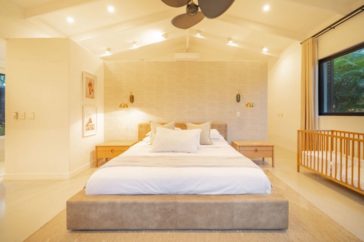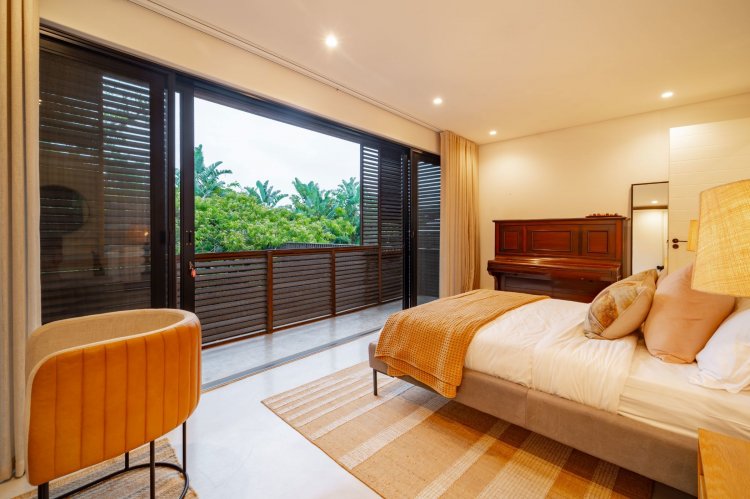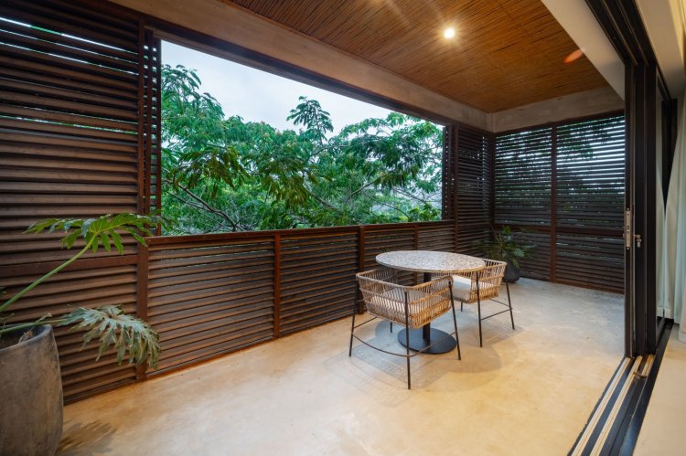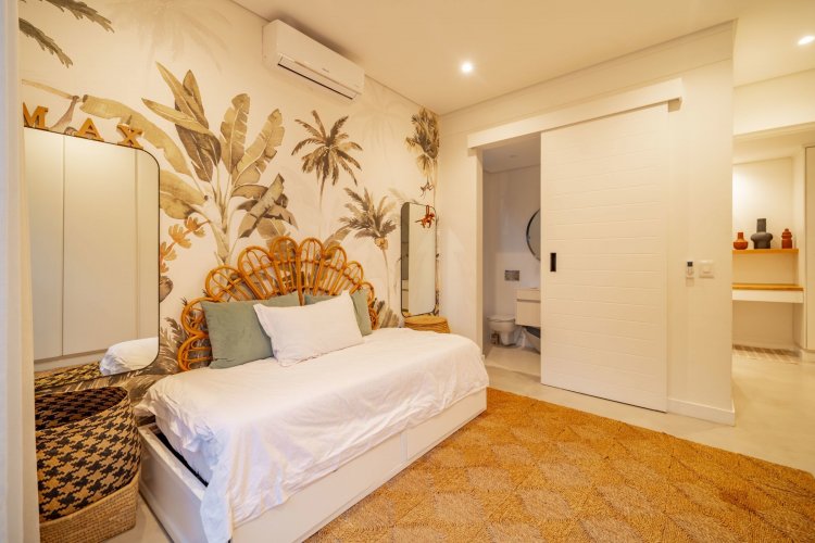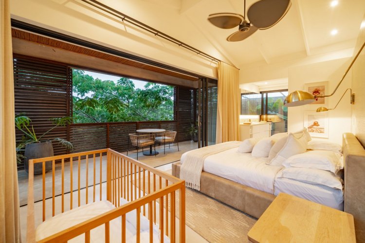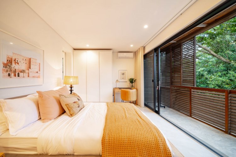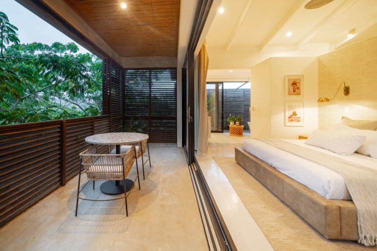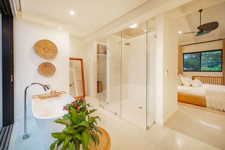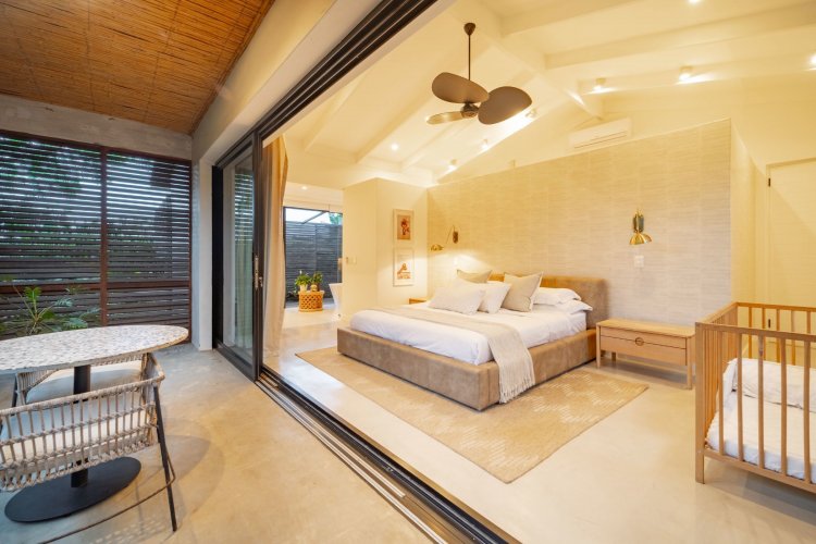 The master suite is a true retreat, complete with a private terrace, walk-in dressing room, and a stunning indoor-outdoor bathroom – ideal for evening showers under the stars. All four bedrooms include their own en-suite bathrooms, with two near the master, and a more private fourth suite with its own balcony overlooking the treetops – perfect for guests or older children.