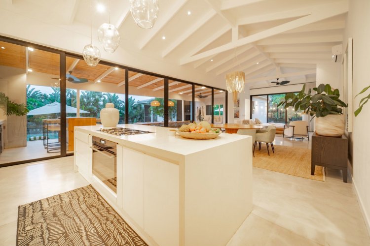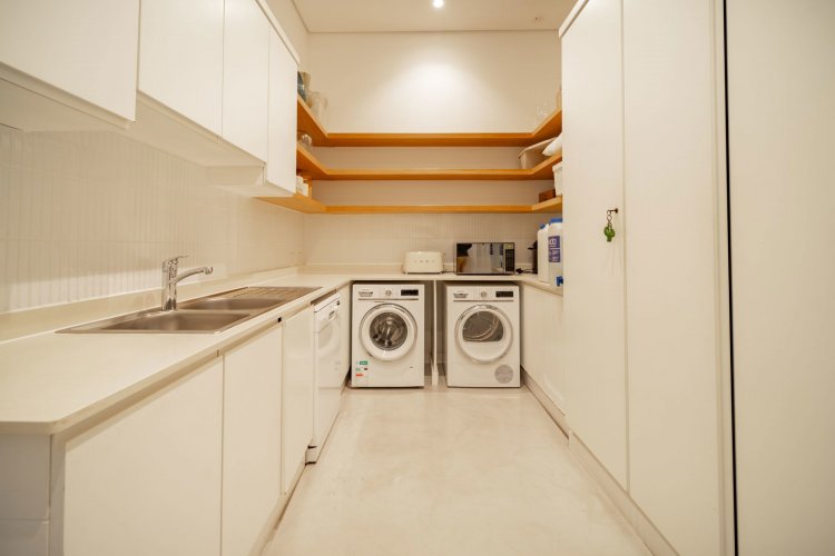 The heart of the home is a high-end kitchen featuring Smeg appliances, which flows into a large scullery and links to versatile staff accommodation or a home office. No corners were cut in the design – with double-volume ceilings, extra-large living spaces, stacking doors with built-in screens, and a full solar system to support sustainable, off-grid living. Additional luxuries include a home gym, sauna, and a wine cellar.