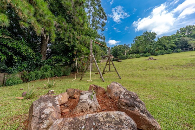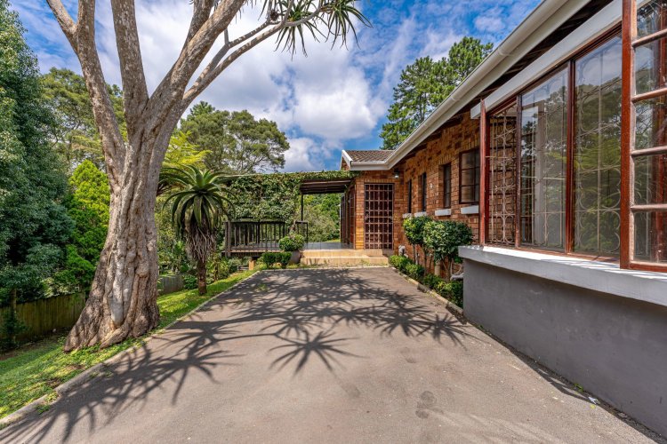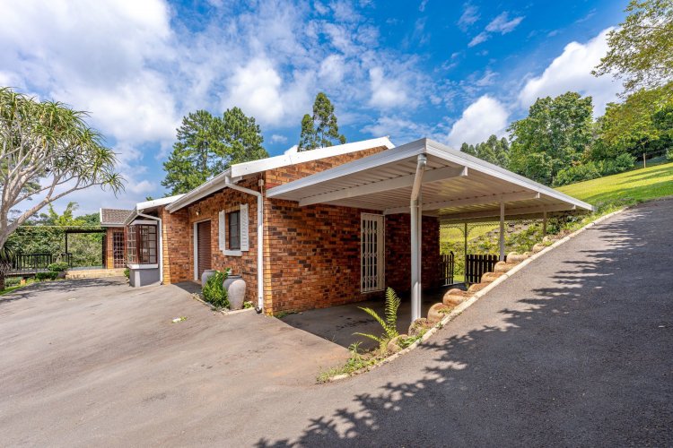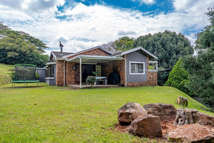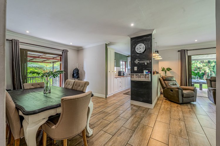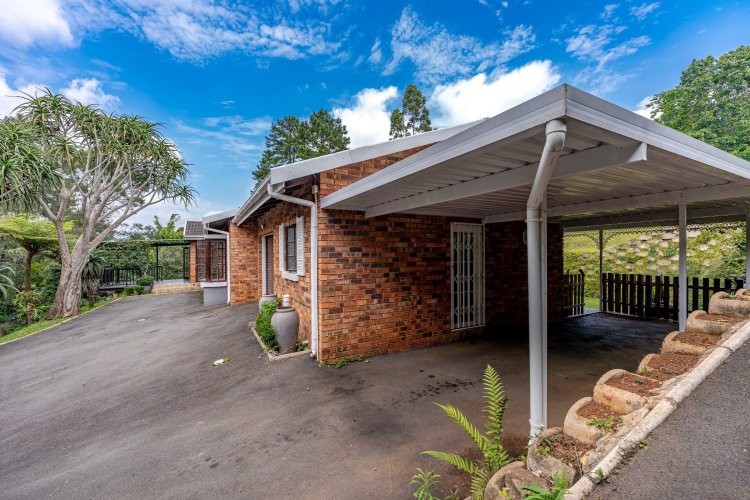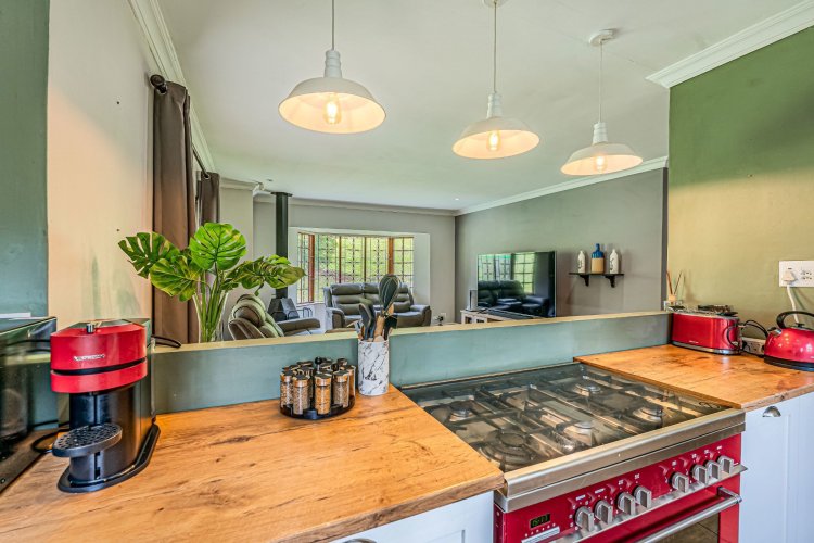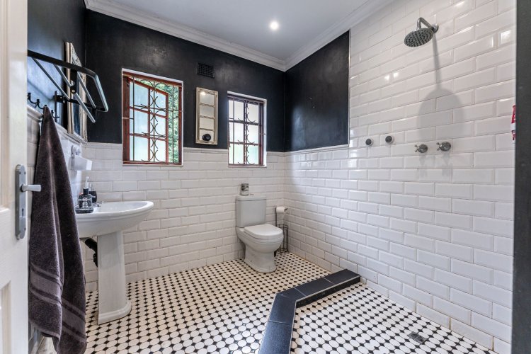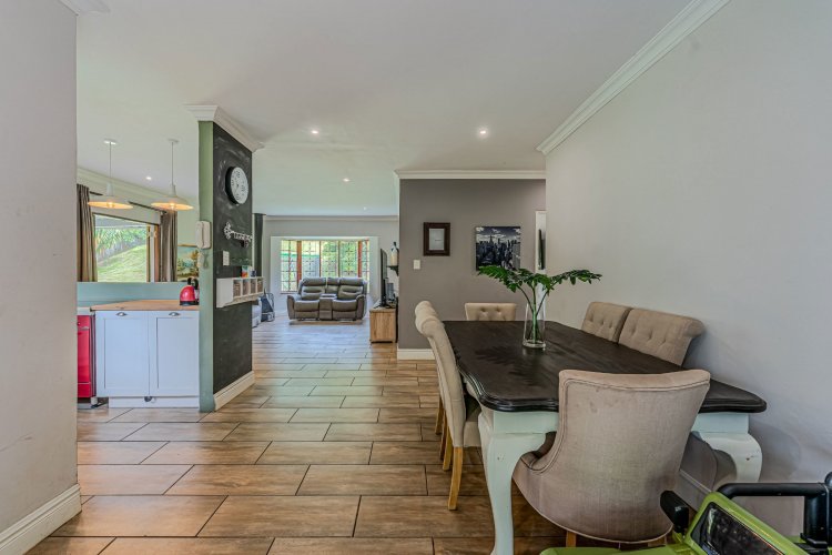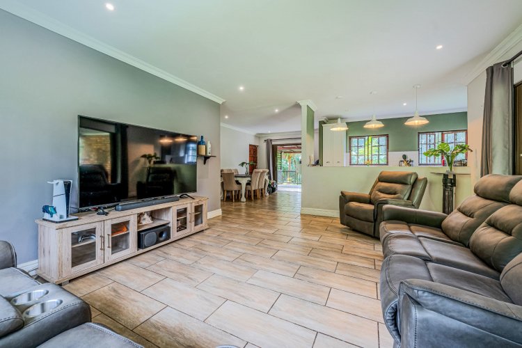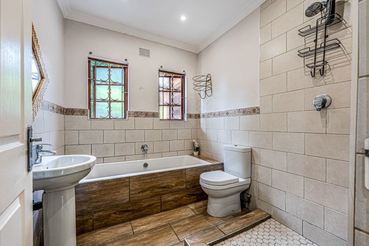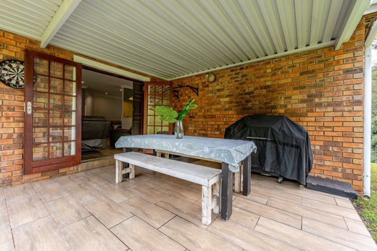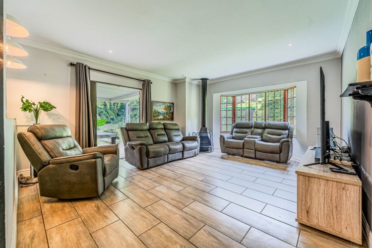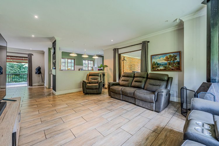 The home is tiled throughout, from the living areas to the bedrooms, which are all situated on one wing. Two bedrooms feature built-in cupboards and share a family bathroom. The double-volume main suite includes ample cupboard space.