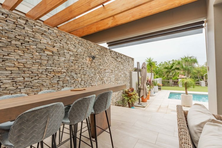 The living area opens onto a covered entertainment patio — an inviting space overlooking the sparkling pool and lush, fully irrigated garden. Whether you're hosting a weekend braai, watching the kids swim, or simply unwinding with a sundowner, this home was made for relaxed outdoor living.