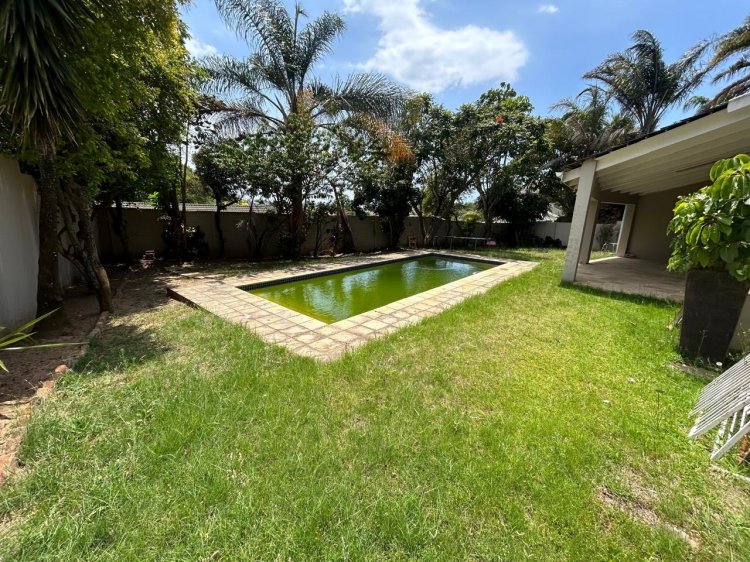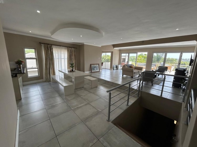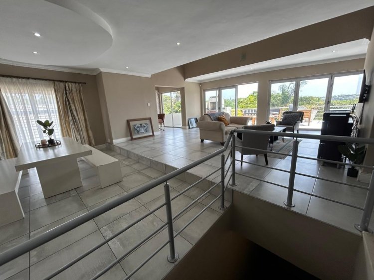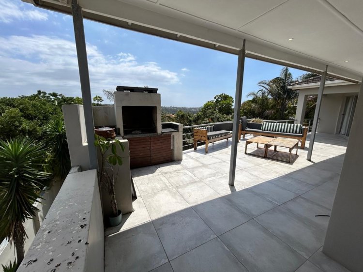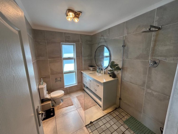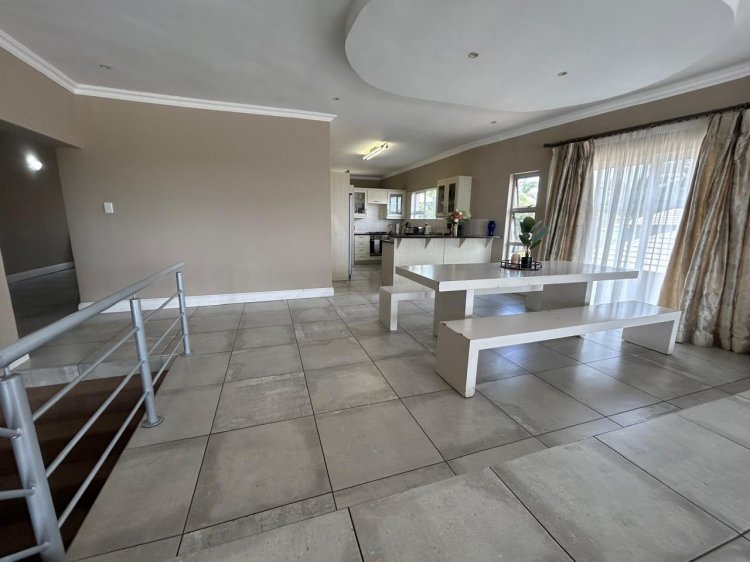 The kitchen is both stylish and functional, featuring ample built-in cupboards and a gas -electric stove. Living spaces flow seamlessly to a covered patio with a built-in braai, ideal for relaxed entertaining and family gatherings.