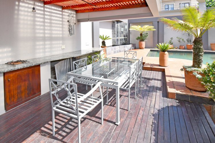 • Lovely entertainment area outside at the back, including an inviting pool, two covered patios, built-in gas braai and stove, and a cascading water feature by the pool.