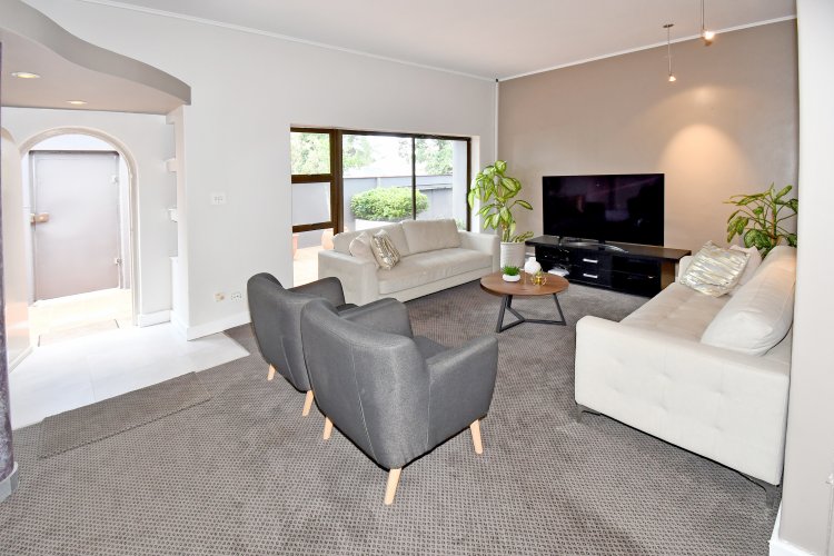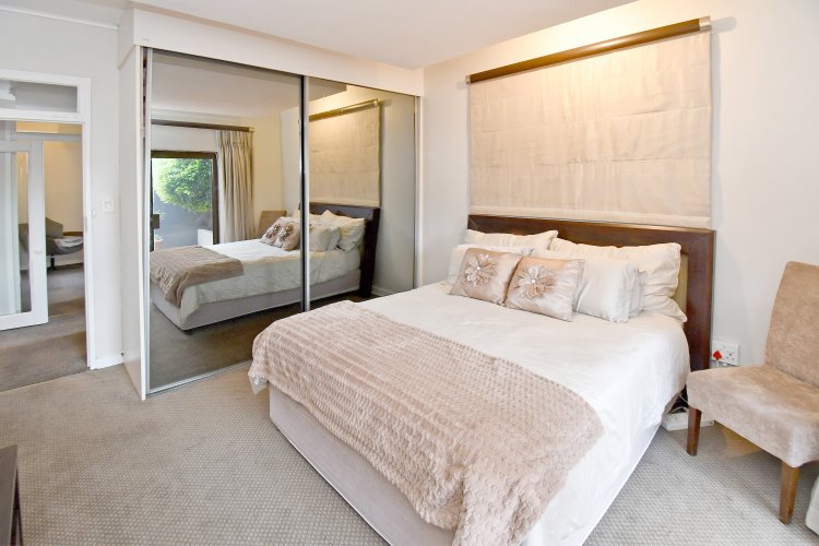 The lounge on the north side and the dining room on the south side both open up via sliding doors to patios outside. The kitchen is well-appointed, with granite tops, an electric hob, double eye-level ovens, and lots of cupboard space. There is a separate laundry room.