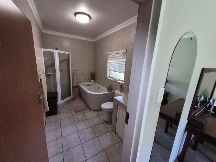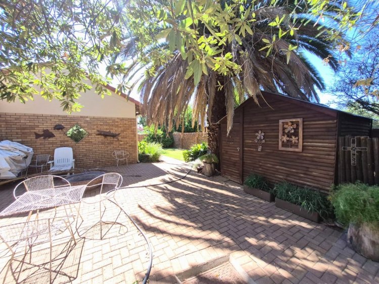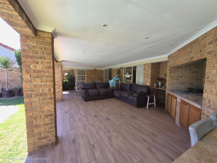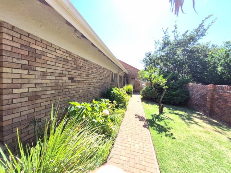 Outdoors, the property truly shines. A well-established, private garden surrounds a covered entertainment area with a built-in braai, overlooking a sparkling swimming pool—perfect for hosting family and friends or enjoying peaceful afternoons at home.