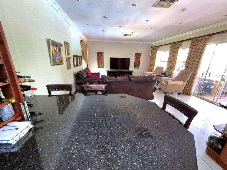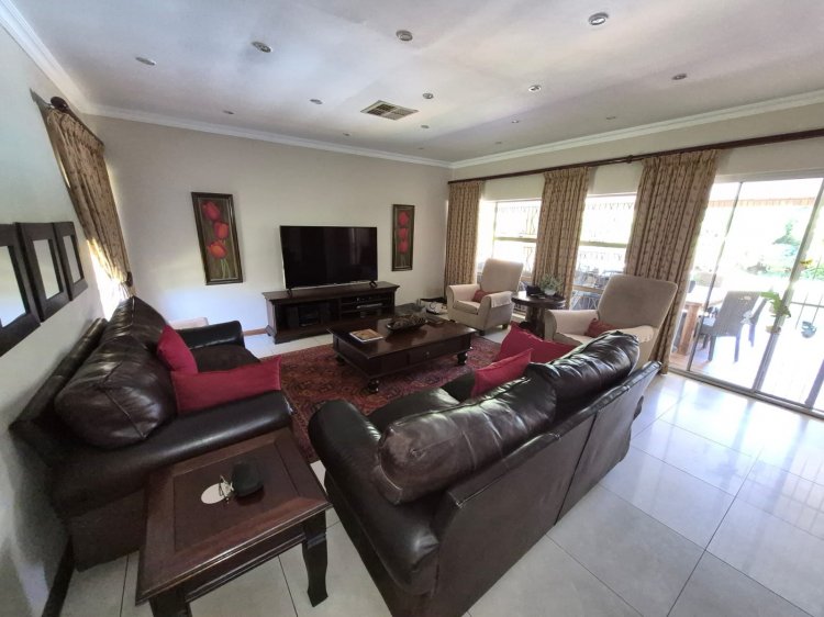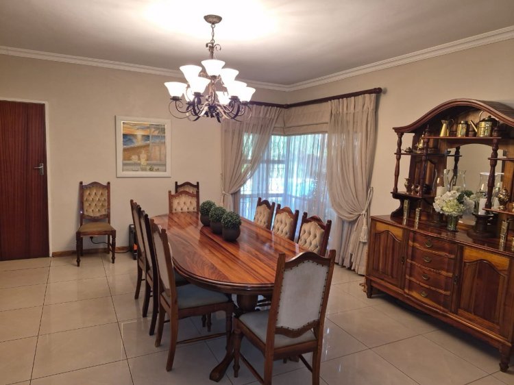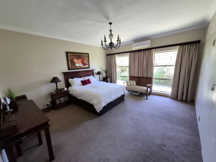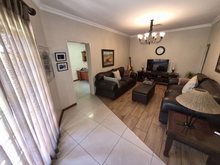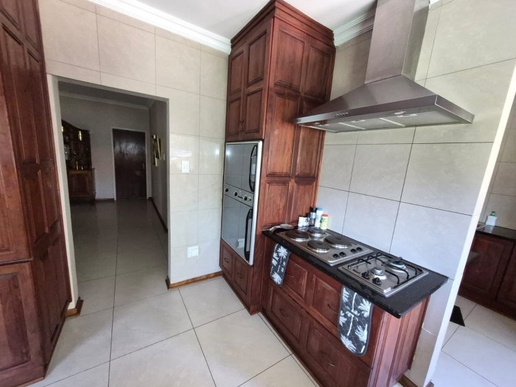 The heart of the home is the elegant rosewood kitchen, complete with ample cupboard space, expansive work surfaces, and a separate scullery. The open-plan layout allows the kitchen to flow seamlessly into a large living area, creating a warm and inviting space for everyday living.
