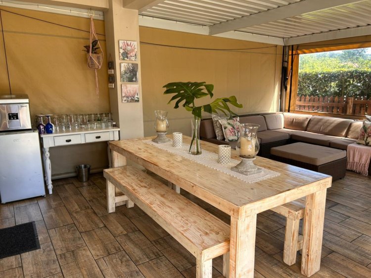 Open plan living area leading onto a fully roofed and canvas sided patio lending itself to perfect entertainment. Kitchen is equipped with a gas hob, and plenty of storage space.