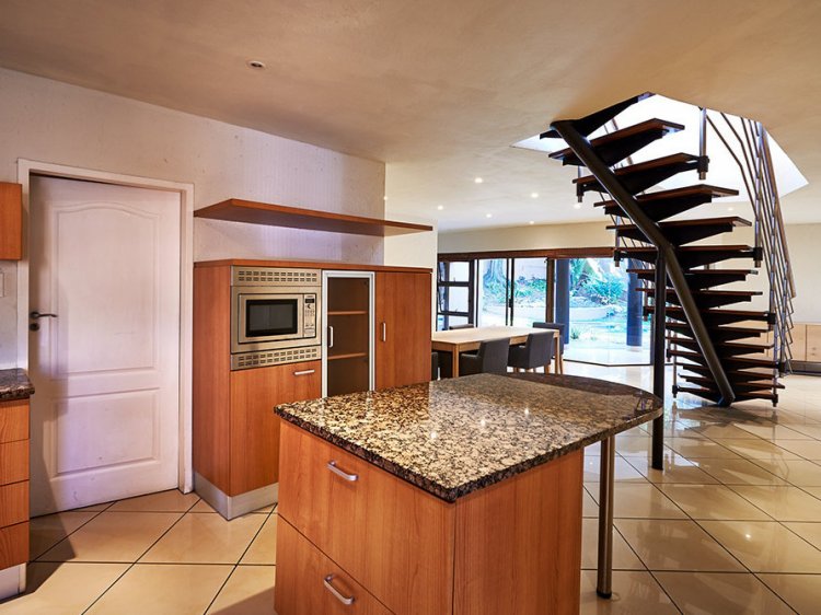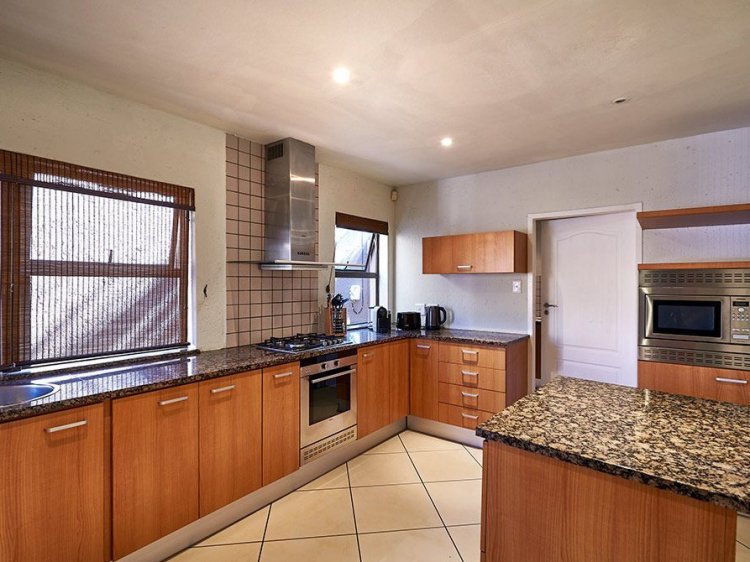 This modern double-storey cluster home features spacious open-plan living areas that flow seamlessly onto a covered patio and private garden — perfect for indoor-outdoor entertaining. The gourmet kitchen is fitted with top-quality integrated appliances, sleek cabinetry, and stone countertops, leading into a separate scullery and dining area.