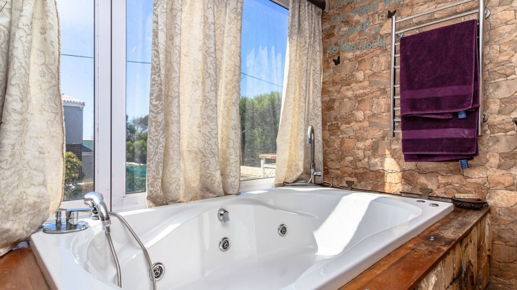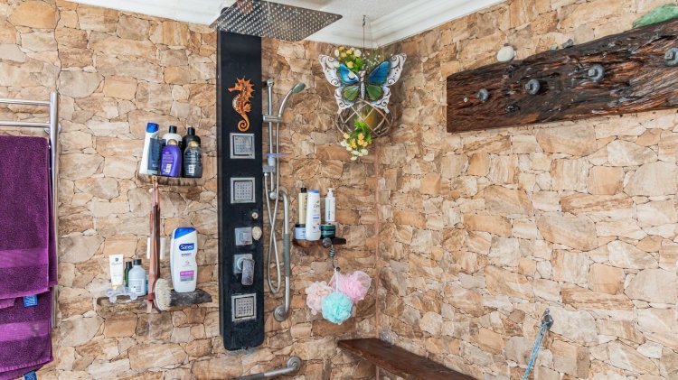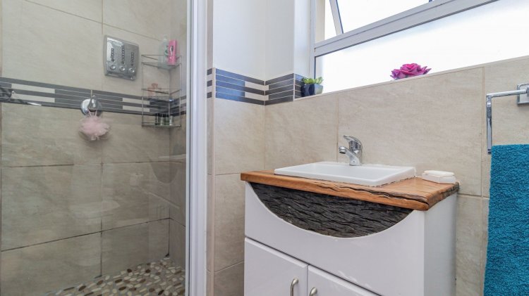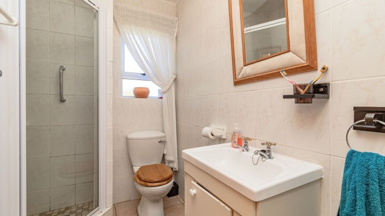 Middle Floor – Private Resting Quarters This level is dedicated to rest and relaxation, offering three bedrooms and three bathrooms. The main bedroom is generously sized with a private balcony. Its en-suite bathroom boasts a jacuzzi with large sliding windows, opening onto magnificent views across Betty’s Bay. A study is also located on this floor, making it an easy and comfortable living area for everyday family life.