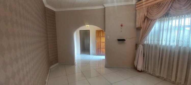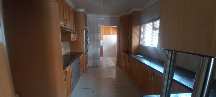The home boasts an open-plan lounge and dining area that flows effortlessly into a well-maintained kitchen. The kitchen offers ample cabinetry, generous workspace, and a separate scullery for added convenience.