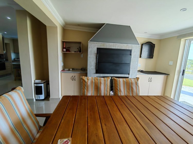 An indoor braai and dining area opens onto the front stoep, where the sound of the ocean enhances the relaxed coastal atmosphere. The home is fitted with an inverter system and is future-ready for the installation of up to 16 solar panels, ensuring uninterrupted power and reduced running costs.