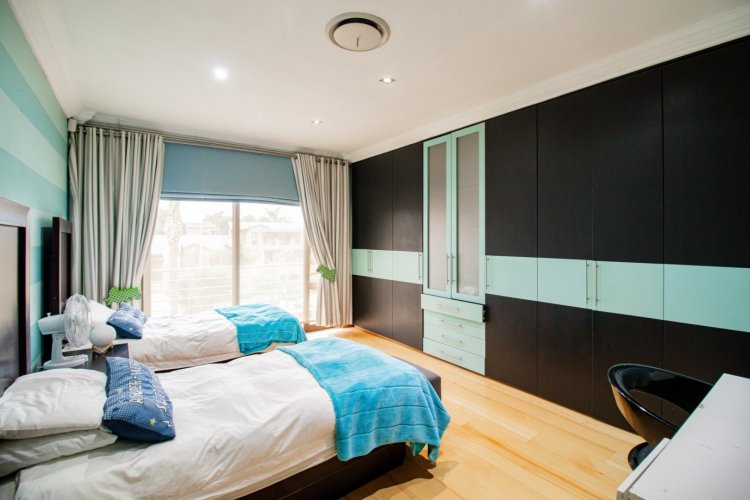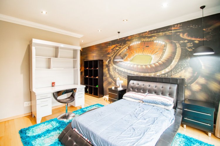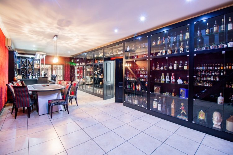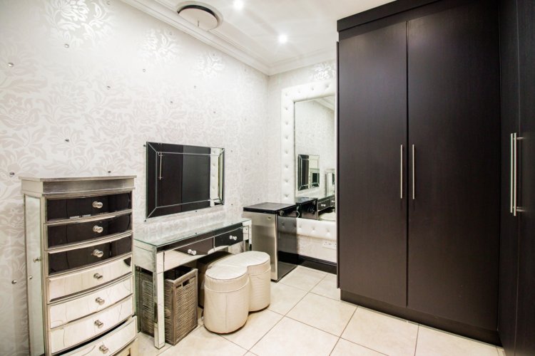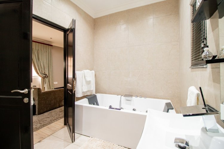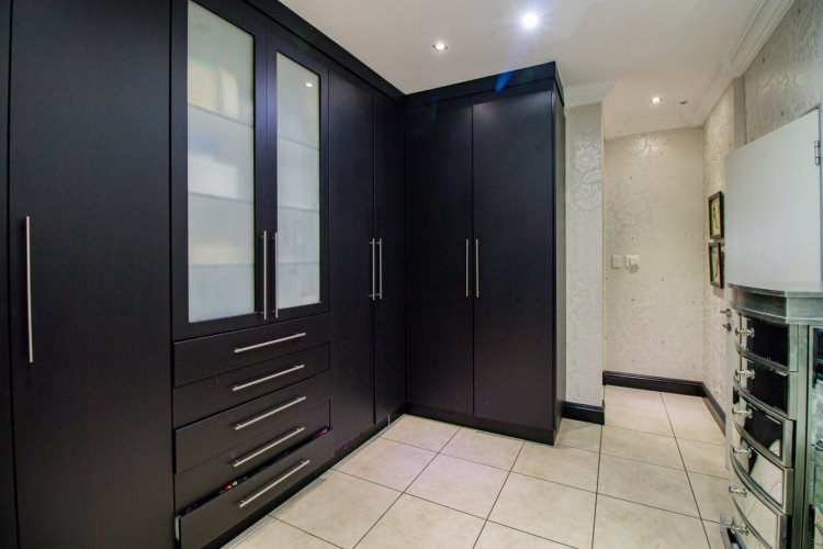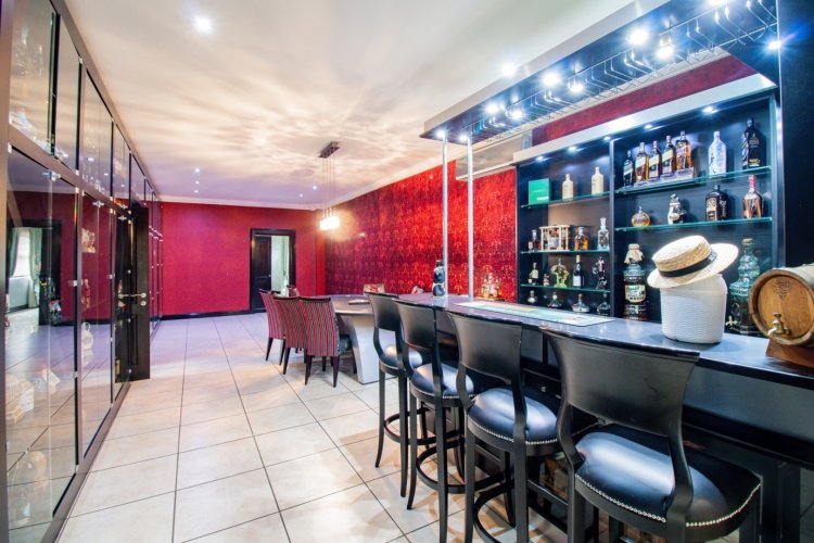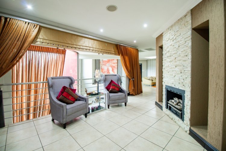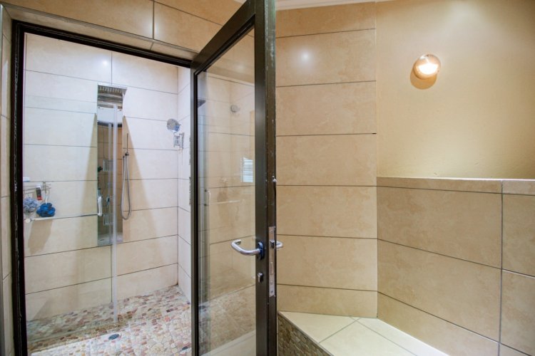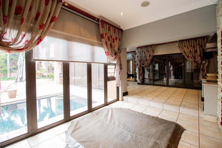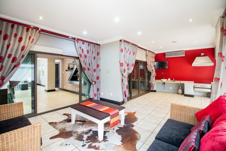 The enclosed entertainment patio is a true showpiece, offering year-round enjoyment with a Jacuzzi, sauna, braai area, and views over the sparkling swimming pool. This is where relaxation and celebration effortlessly coexist.