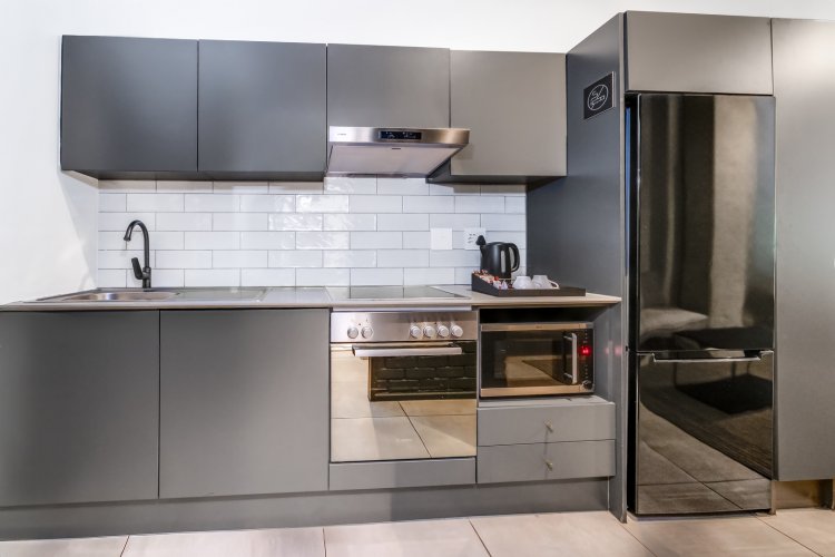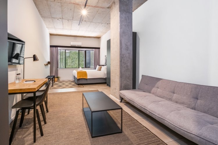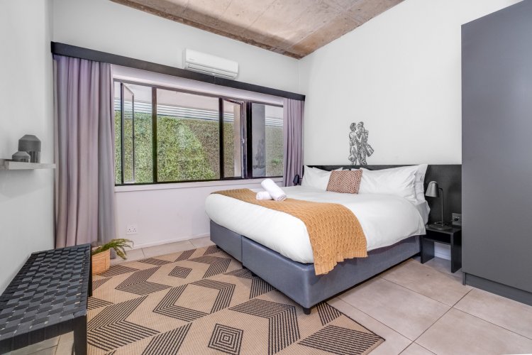 The apartment itself is sleek, spacious, and thoughtfully designed for modern living, complete with air-conditioning for comfort year-round.