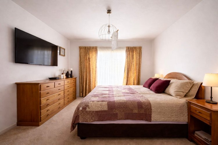 The first bedroom comfortably fits a queen-size bed, features ample built-in cupboards, and opens to a pleasant view of the open patio. The shared bathroom includes a bath and toilet; the unit was originally fitted with a shower, and there is still sufficient space to reinstall one if desired. The second bedroom is versatile, ideal as a guest room or home office, and can accommodate a double bed with ease. Completing the home is an open patio, perfect for enjoying fresh air and outdoor living, daily enjoyment.