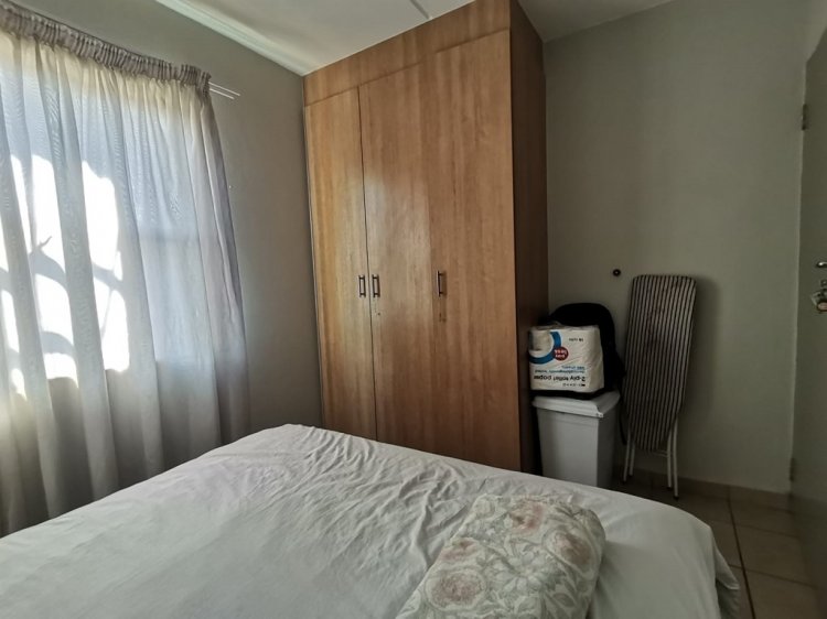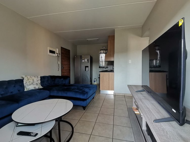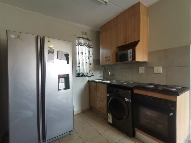 This well-managed and 24-hour surveillance complex offers a first-floor unit with a charming open-plan lounge and kitchen, complete with ample built-in cupboards and a fitted stove with oven, leading to the balcony with views.