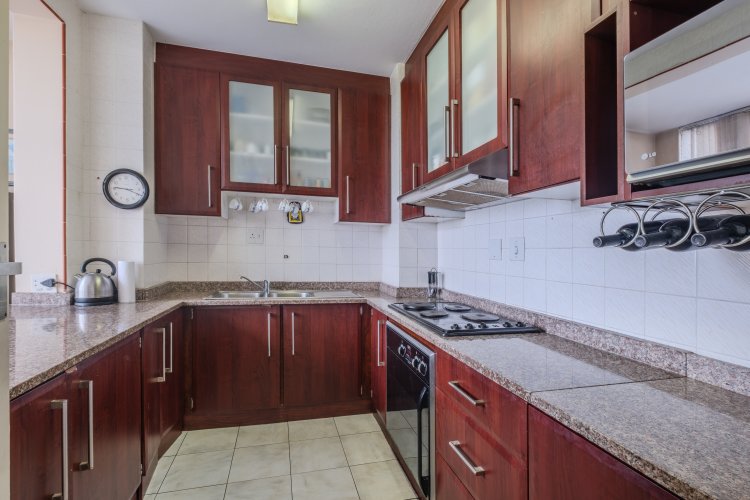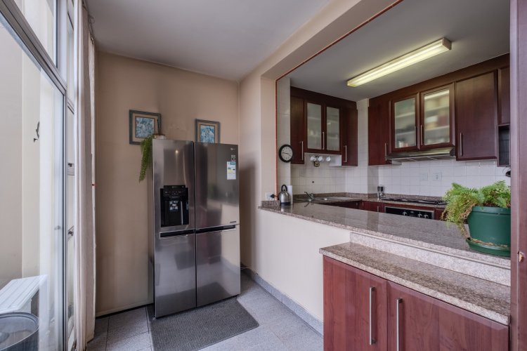 The open plan living and dining area flows seamlessly from the neat, fitted kitchen to a generous double volume balcony, an ideal space for outdoor dining, relaxing, or simply soaking in the scenery. The kitchen features granite countertops and good storage, and both the lounge and kitchen enjoy direct balcony access. A guest loo adds convenience on this level.