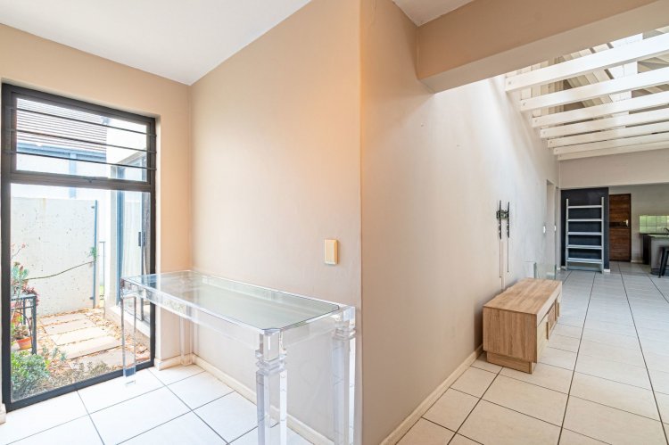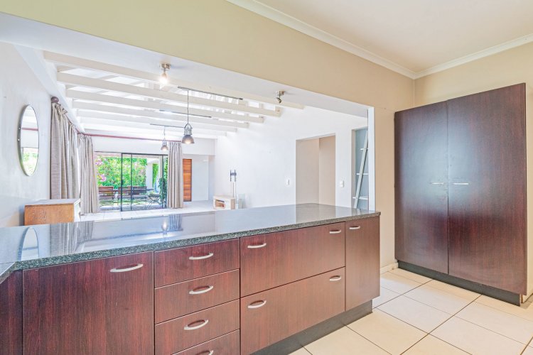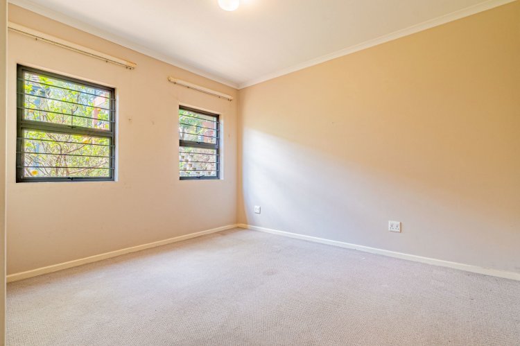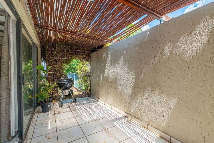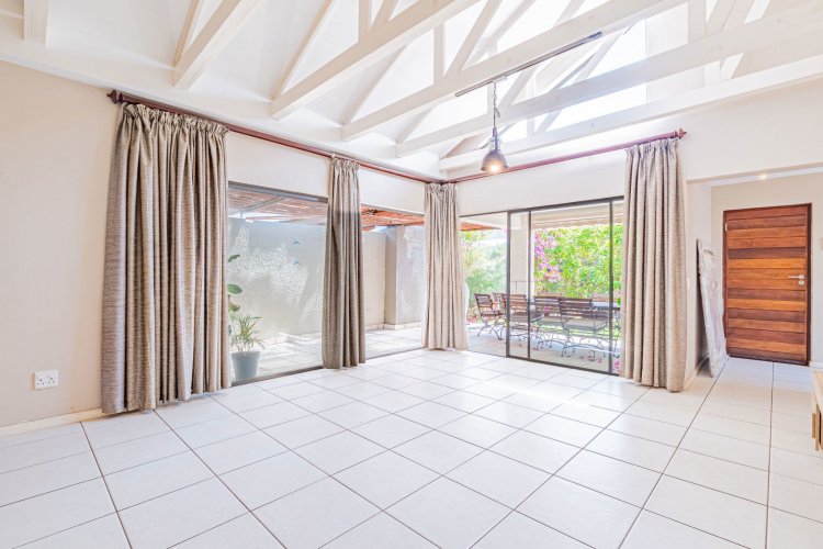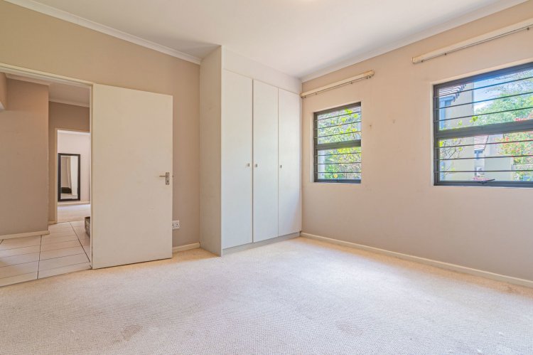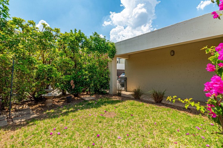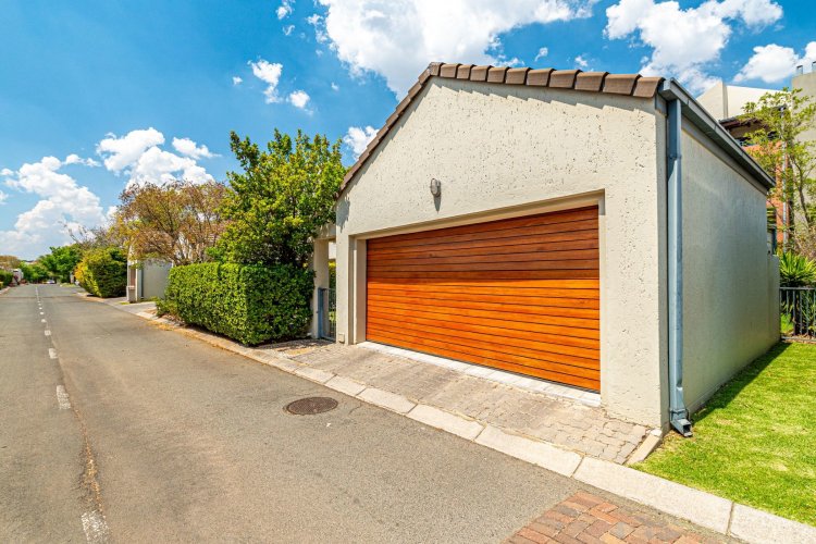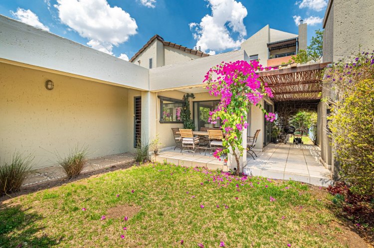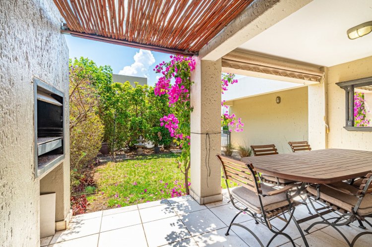 Inside one of the most well-managed and secure estates in an excellent location in Bryanston, this single-storey cluster-style townhouse offers all the freedom of a freestanding home, with none of the maintenance worries. Set on a private stand with a wraparound garden, this independent unit enjoys a sense of space and seclusion rare in sectional title living. The front door opens into an airy entrance hall framed by a picture window overlooking a tranquil courtyard. Immediately, your attention is drawn to the spacious, open-plan living area, where the ceiling lifts and open trusses draw your gaze upwards. Light and air flood in. With a double set of glass sliding doors, the lounge spills onto an undercover patio on two sides, and a built-in braai adds to the dreamy setting, perfect for relaxed afternoons on a summer's day. The well-designed kitchen is the backdrop to the open-plan living area and features a Bosch oven, ample counter space and storage, and room for two plumbed appliances, plus a third. The back door opens to a private drying yard. There are two spacious bedrooms, including a main en-suite with a full bathroom and sliding doors leading to a private garden, and a second bedroom with its own stylish bathroom. Generous cupboard space, including an all-too-rare linen cupboard and thoughtful finishes, makes daily life effortless. A double automated garage provides direct access to the home, adding practicality and security. Pet-friendly, private, and impeccably managed, the estate is home to a wonderfully mixed community; a true testament to its comfort and appeal. Whether you're scaling down or starting out, this is a home where independence, tranquillity, and convenience come together perfectly.
