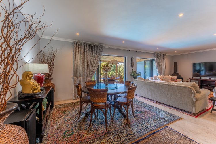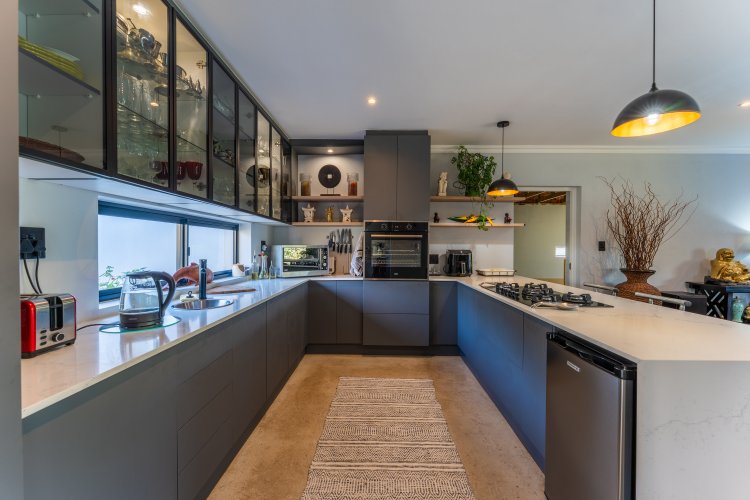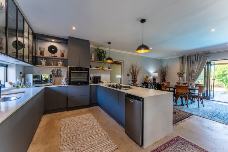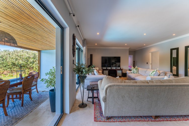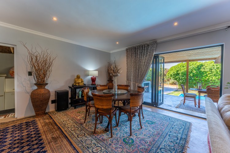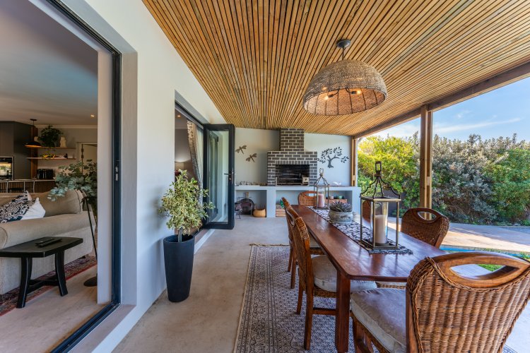 The home offers expansive open-plan living, centred around a stylish modern kitchen that flows seamlessly into the dining and lounge areas. Large stack doors open onto a covered patio with a built-in braai, creating an effortless indoor-outdoor flow and overlooking a sparkling swimming pool — ideal for relaxed coastal living and entertaining. A built-in fireplace adds warmth and character to the main lounge.