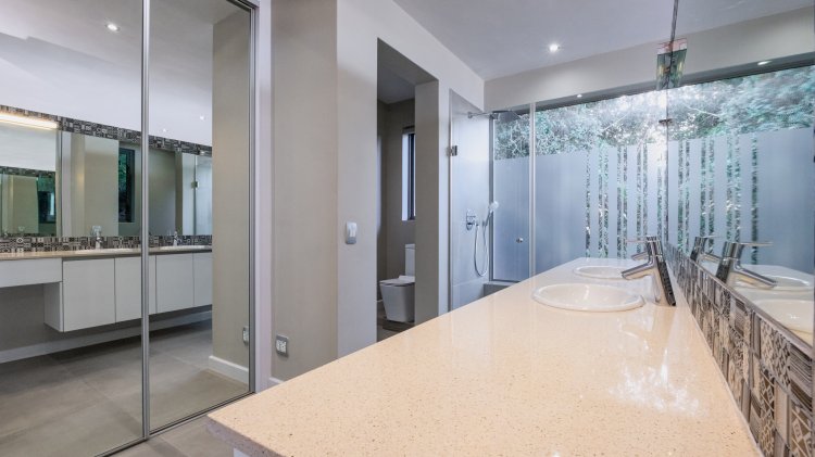 A standout feature is the illuminated rock, proudly displayed behind a feature window — a symbolic and literal foundation of this remarkable home.