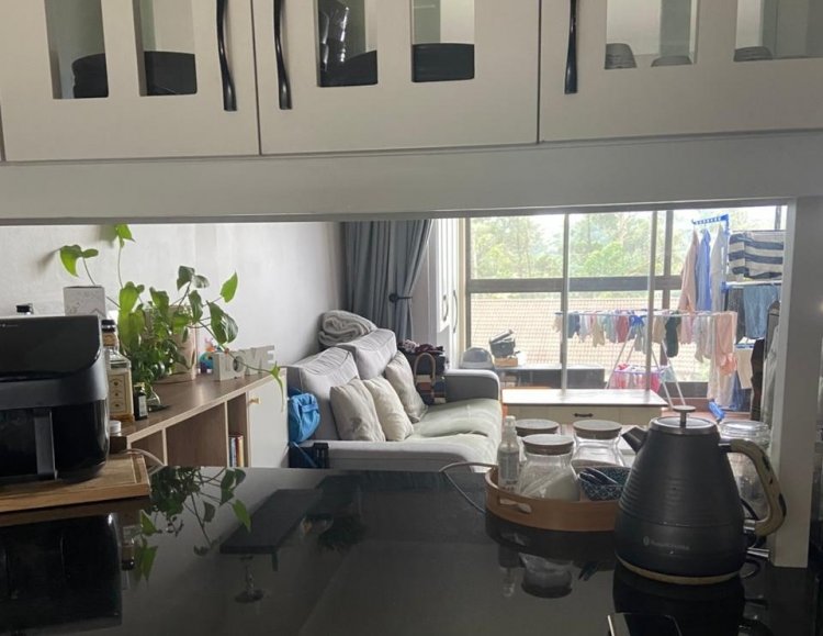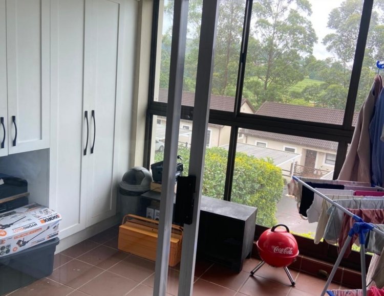 The balcony has been enclosed with glass and aluminium to create an additional living or utility area, complete with extra built-in cupboards.