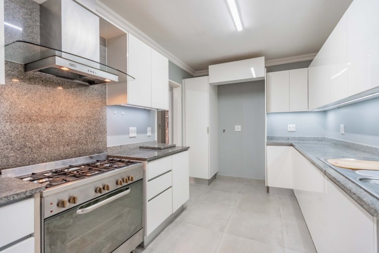 The modern kitchen is thoughtfully designed with a built-in oven and hob, sleek finishes, and space for a large double-door fridge. Leading to a separate scullery and a staff room with modern shower and loo — a rare and valuable addition that enhances everyday practicality.