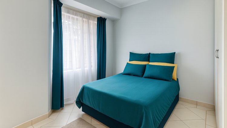 The two bedrooms are generously sized, with the master bedroom featuring an ensuite bathroom. The second bathroom includes a bathtub, ideal for families or unwinding after a long day.