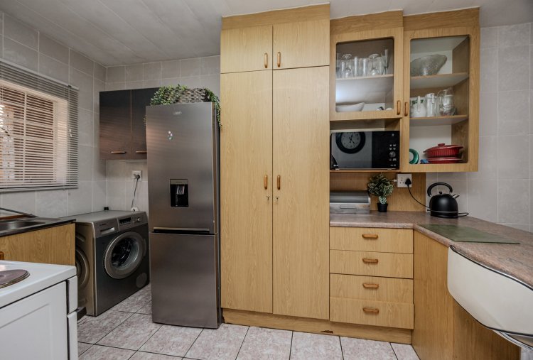 The contemporary kitchen is well-designed with plenty of cupboard space, providing both style and functionality.