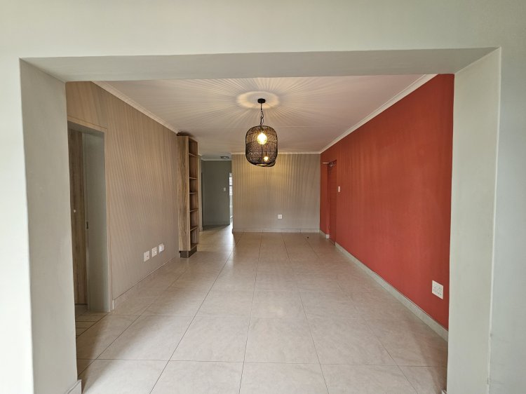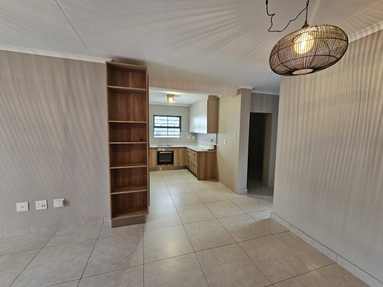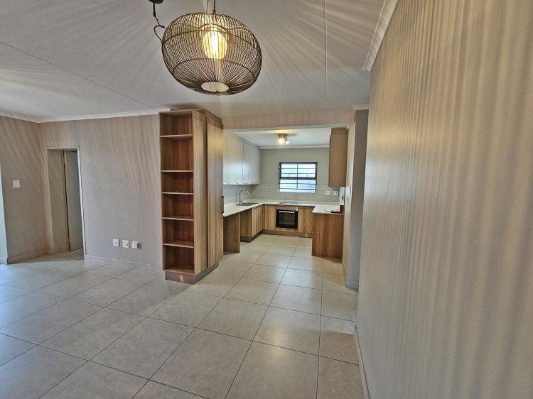 The welcoming living area flows seamlessly into an open-plan kitchen, thoughtfully laid out with ample cupboard space, accommodation for three appliances, and a double fridge – perfect for effortless day-to-day living and entertaining.