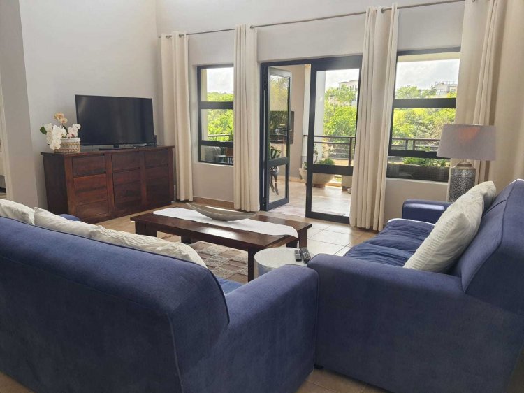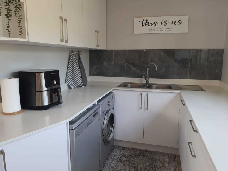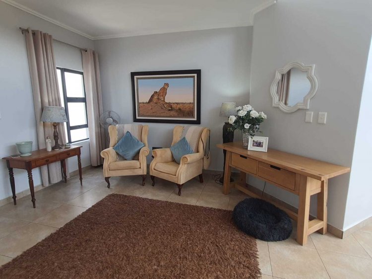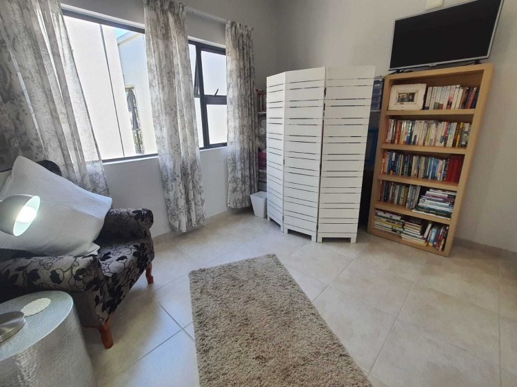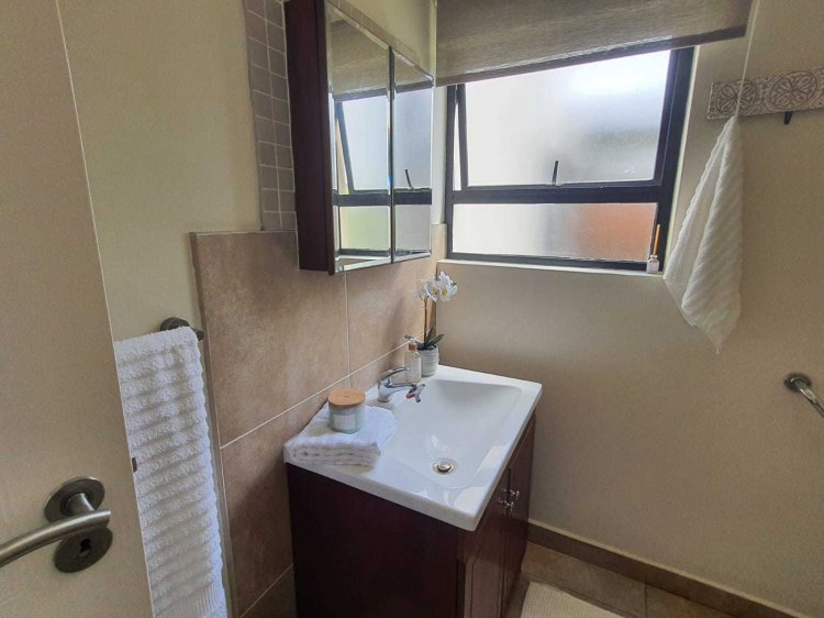 Step into this stunning 3-bedroom, 2-bathroom apartment that combines modern comfort with serene living. Bathed in natural light, the home features a beautifully renovated white kitchen with sleek quartz countertops and ample cupboard space—perfect for any home chef. The open-plan design seamlessly connects the kitchen, dining area, and lounge, flowing effortlessly onto a covered patio with a built-in braai, ideal for entertaining.