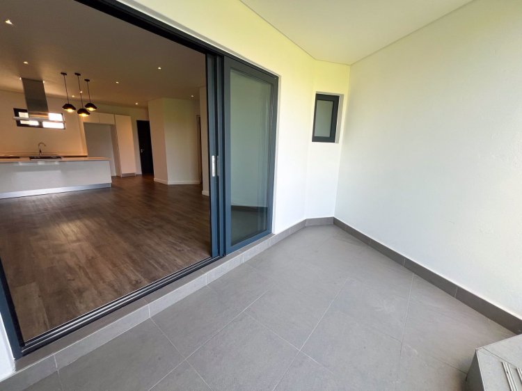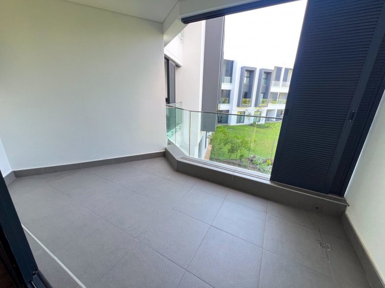 The sleek kitchen features Caesarstone countertops, a gas hob, electric oven, food waste disposal, and ample storage—perfect for both everyday living and entertaining. Sliding doors open to a spacious balcony overlooking the landscaped surroundings, ideal for relaxed mornings or sunset dining.