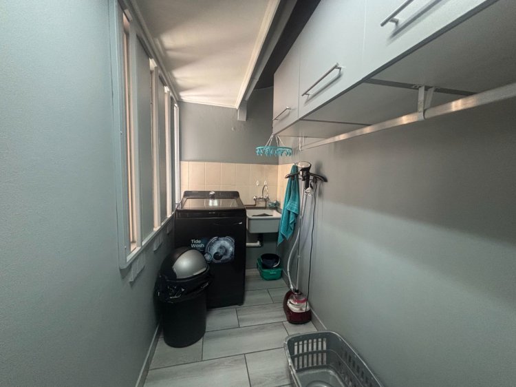 Separate laundry with basin, cupboard space, washing machine connection, washing line & ample space.