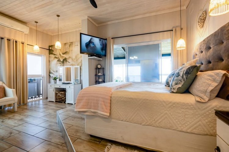 All three bedrooms are generously sized and fitted with cupboards and ceiling fans. The luxurious main bedroom features a full en-suite bathroom with bath and shower, air conditioning, and stunning sea views - your own private retreat.